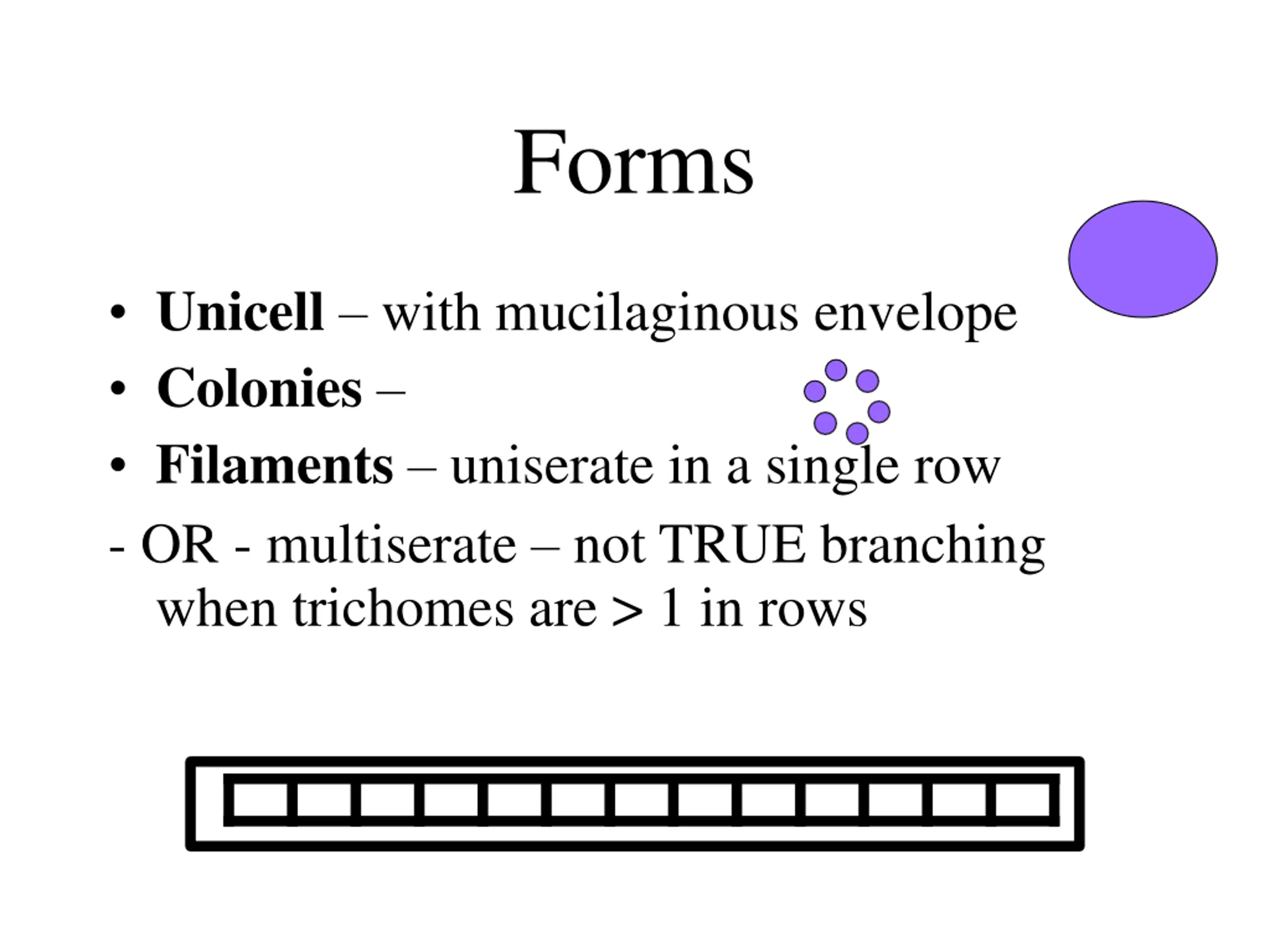 Forms Unicell with mucilaginous envelope Colonies Filaments uniserate in a single row - OR - multiserate not TRUE branching when trichomes are > 1 in rows