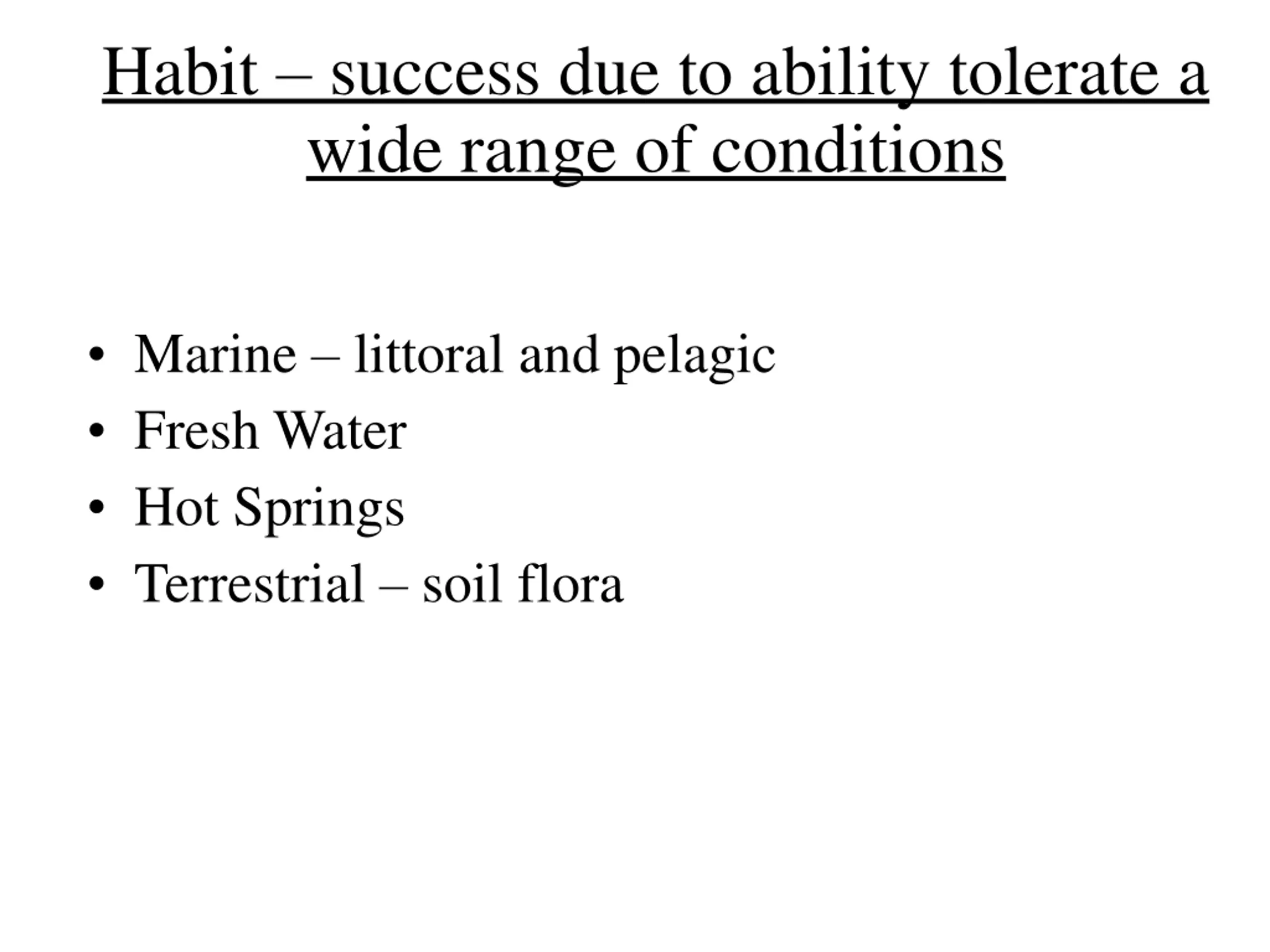 Habit success due to ability tolerate a wide range of conditions Marine littoral and pelagic Fresh Water Hot Springs Terrestrial soil flora
