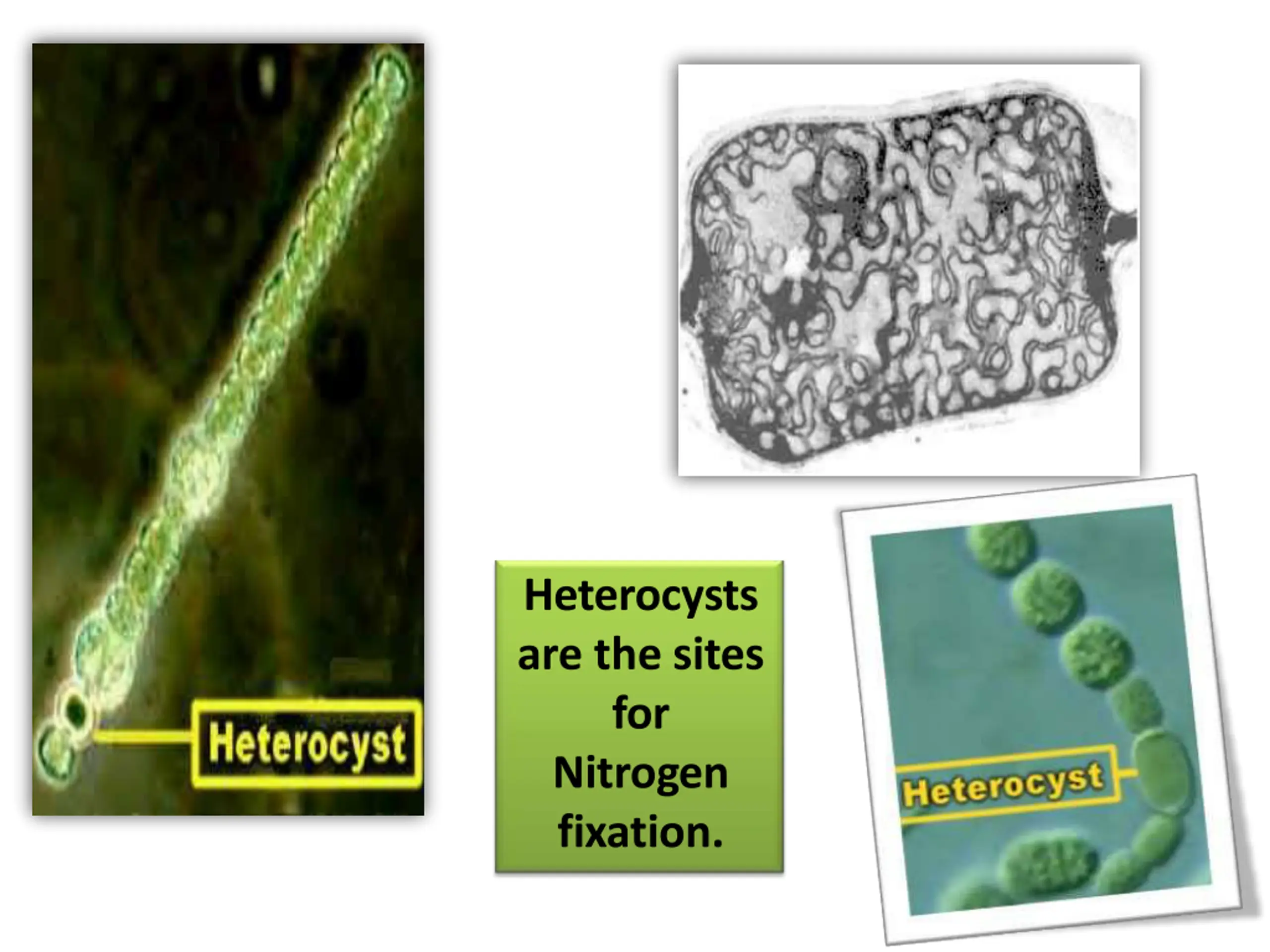 Heterocyst Larger than vegetative cells Hollow looking Thick walled doesn t allow atmospheric gas to enter. Photosynthetically inactive No CO2 fixation or O2evolution Formation of heterocysts triggered by [molybdenum] and and low [nitrogen]