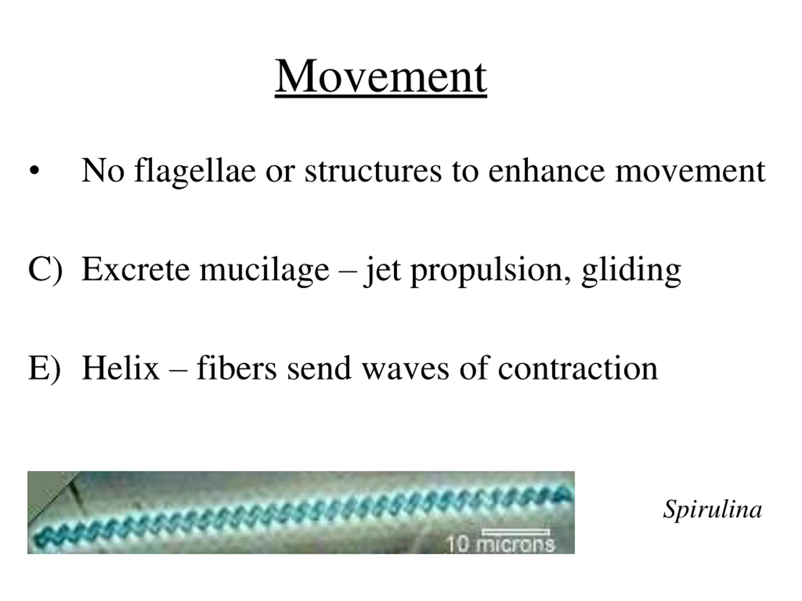 Movement No flagellae or structures to enhance movement C) Excrete mucilage jet propulsion, gliding E) Helix fibers send waves of contraction Spirulina