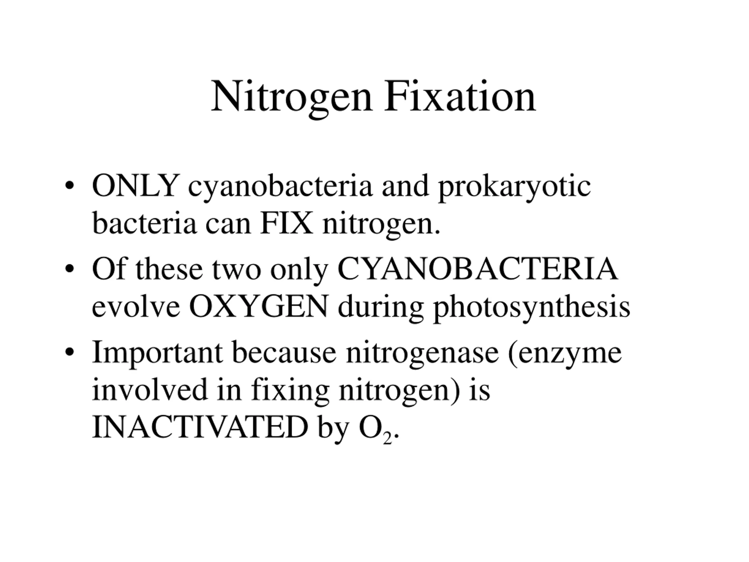 Nitrogen Fixation ONLY cyanobacteria and prokaryotic bacteria can FIX nitrogen. Of these two only CYANOBACTERIA evolve OXYGEN during photosynthesis Important because nitrogenase (enzyme involved in fixing nitrogen) is INACTIVATED by O2.