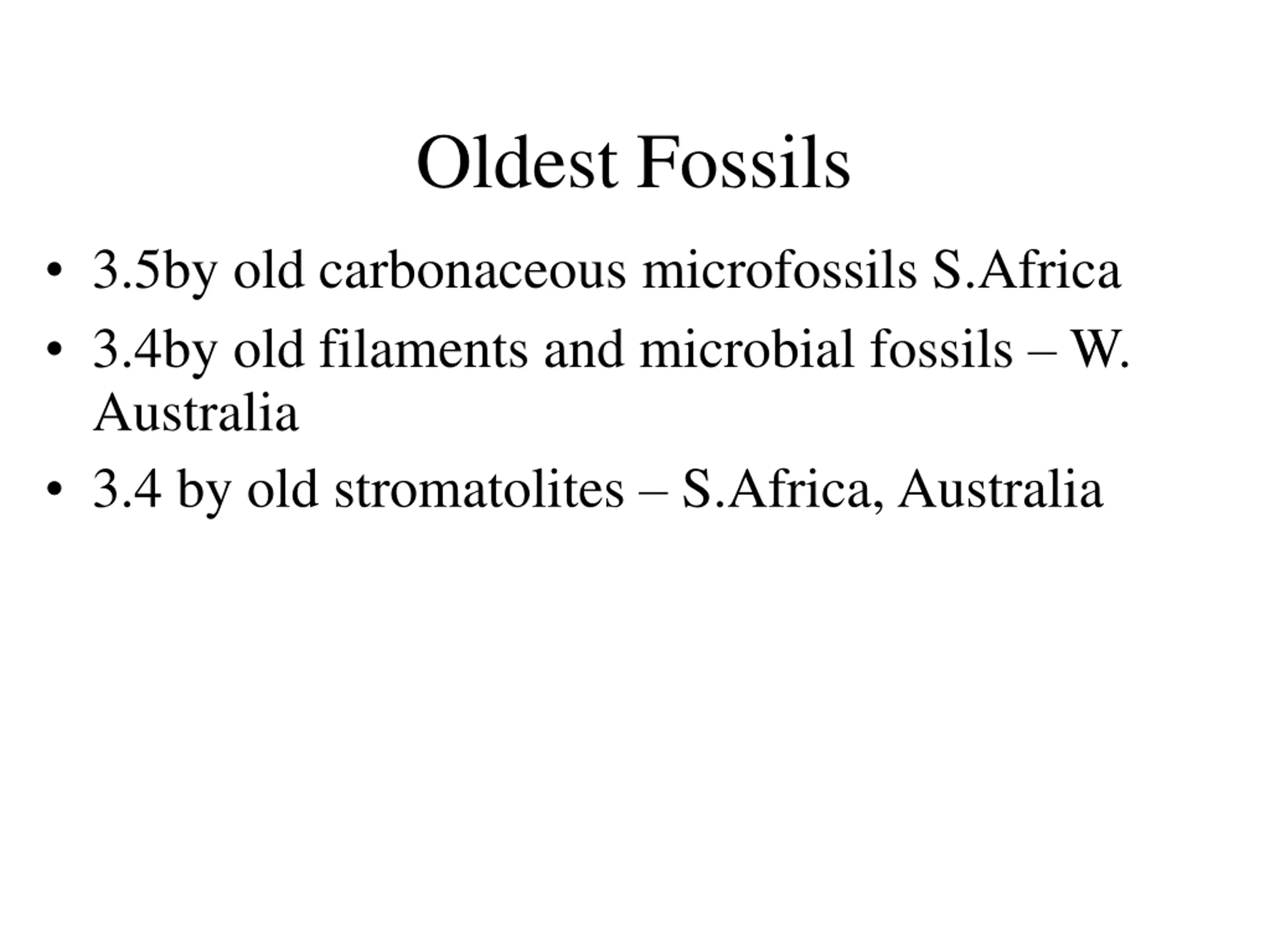 Oldest Fossils 3.5by old carbonaceous microfossils S.Africa 3.4by old filaments and microbial fossils W. Australia 3.4 by old stromatolites S.Africa,Australia
