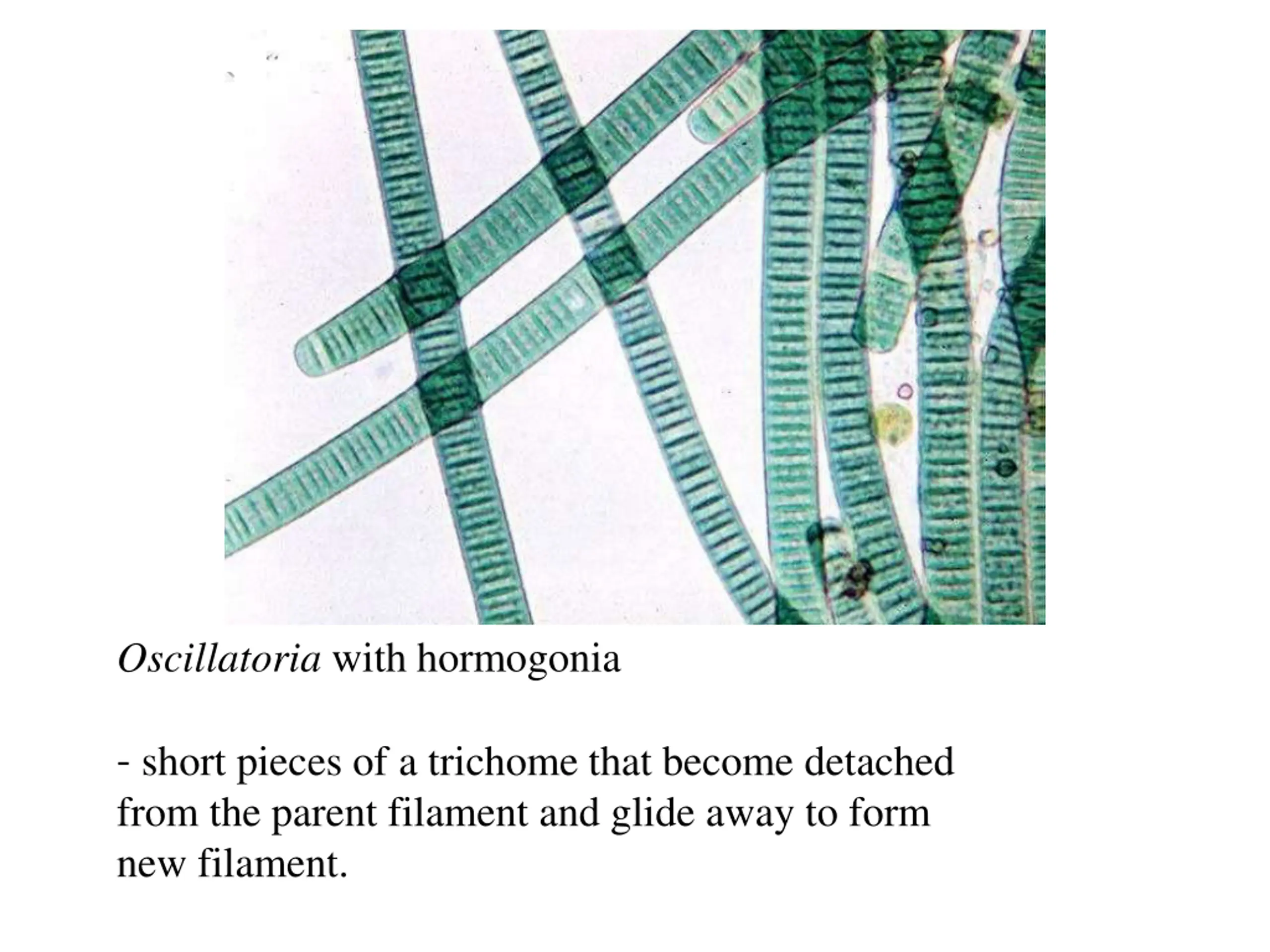 Oscillatoria with hormogonia - short pieces of a trichome that become detached from the parent filament and glide away to form new filament.