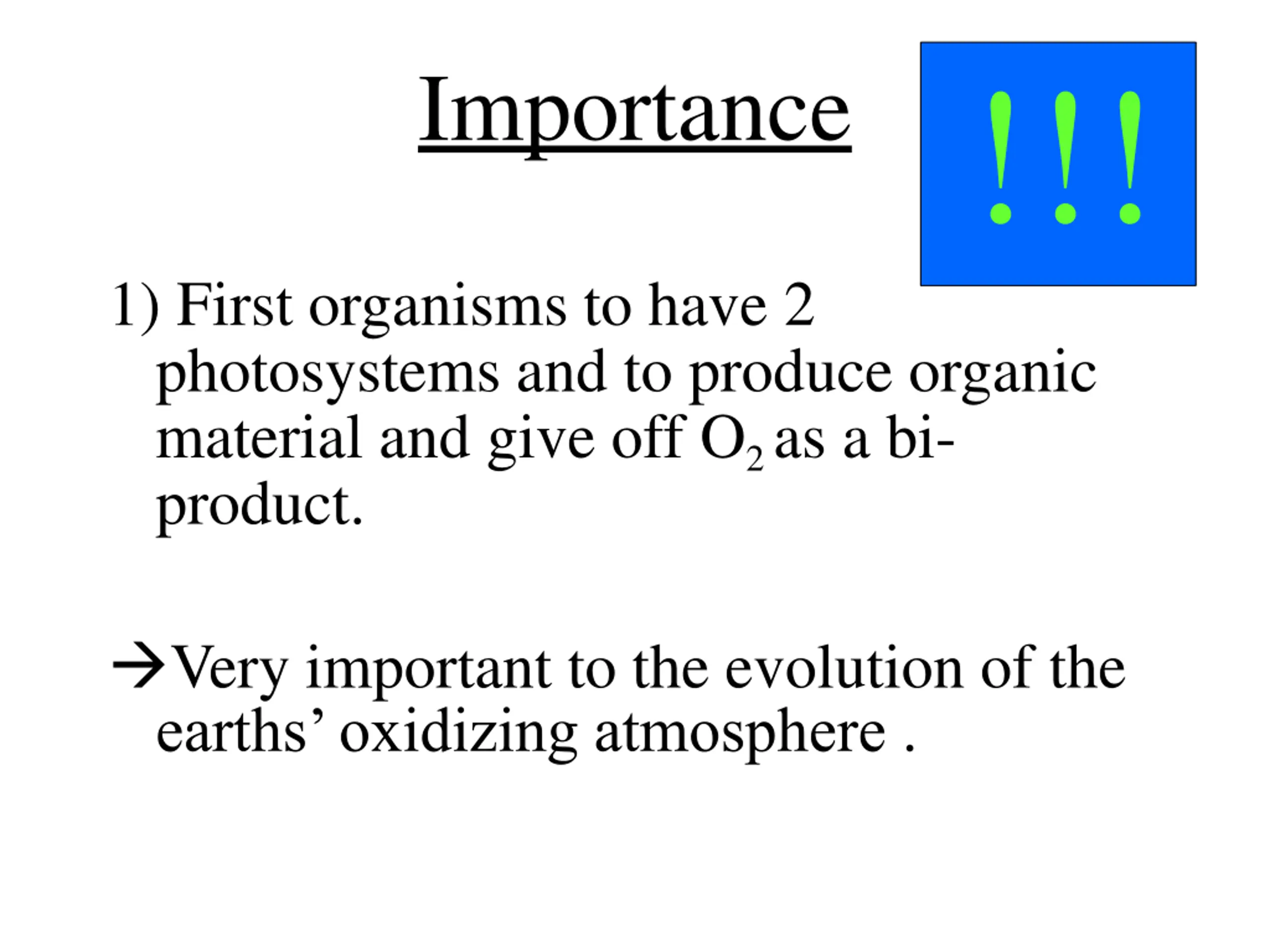 !!! Importance 1) First organisms to have 2 photosystems and to produce organic material and give off O2 as a bi- product. Very important to the evolution of the earths oxidizing atmosphere .