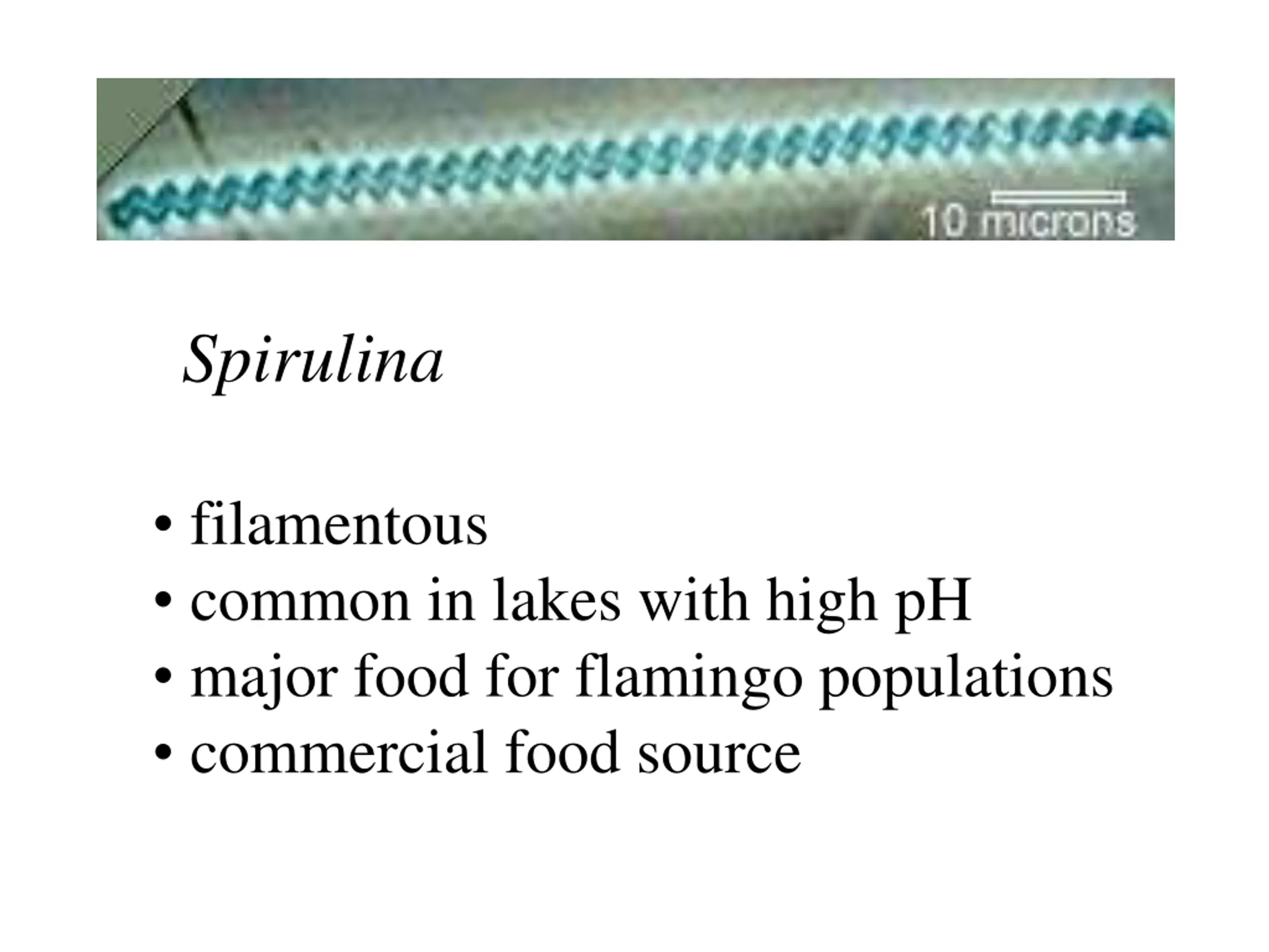 Spirulina filamentous common in lakes with high pH major food for flamingo populations commercial food source