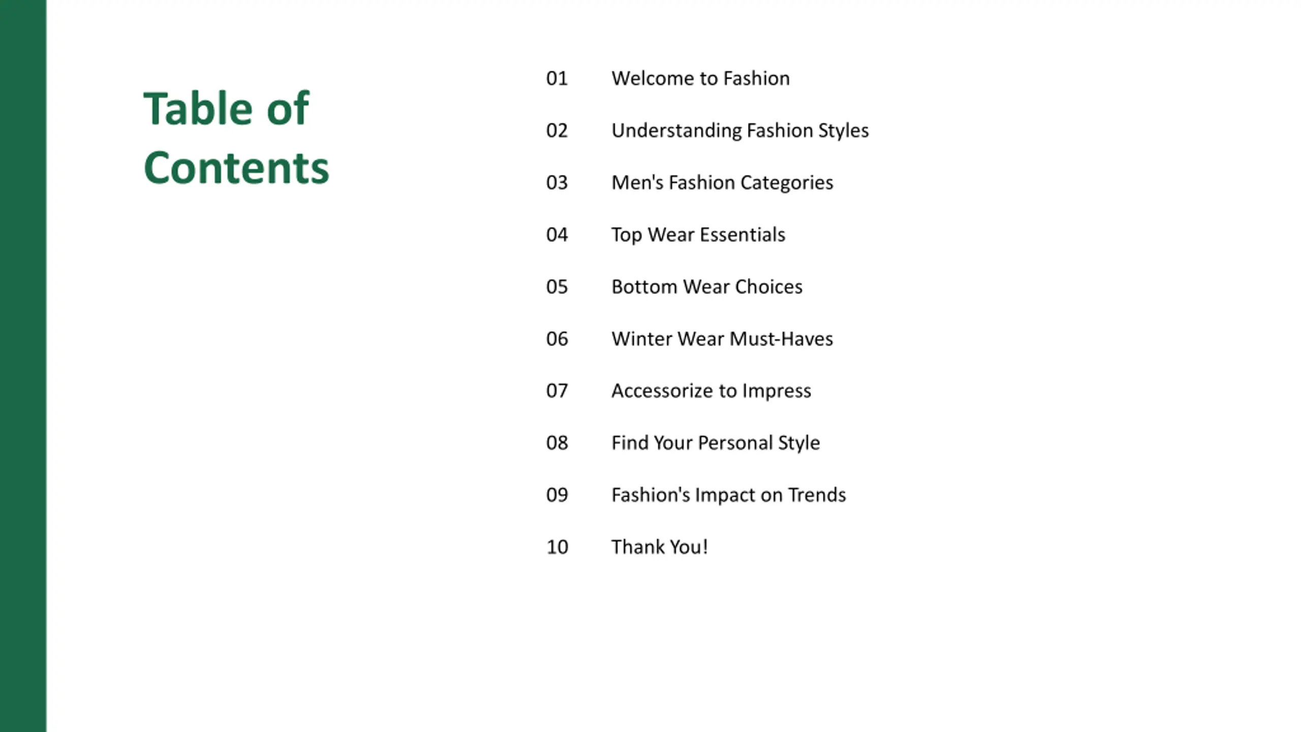 01 Welcome to Fashion Table of Contents 02 Understanding Fashion Styles 03 Men's Fashion Categories 04 Top Wear Essentials 05 Bottom Wear Choices 06 Winter Wear Must-Haves 07 Accessorize to Impress 08 Find Your Personal Style 09 Fashion's Impact on Trends 10 Thank You!