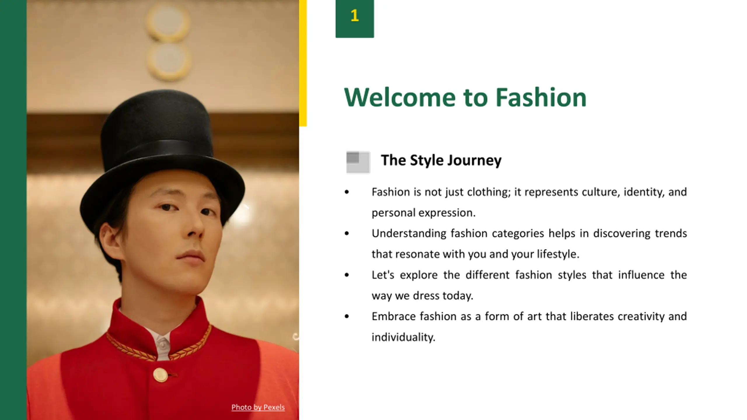 1 Welcome to Fashion The Style Journey Fashion is not just clothing; it represents culture, identity, and personal expression. Understanding fashion categories helps in discovering trends that resonate with you and your lifestyle. Let's explore the different fashion styles that influence the way we dress today. Embrace fashion as a form of art that liberates creativity and individuality. Photo by Pexels