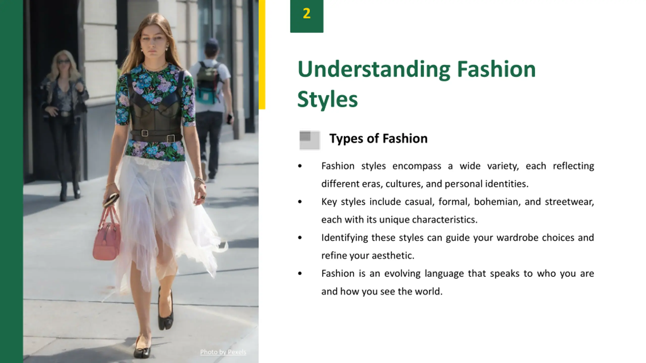 2 Understanding Fashion Styles Types of Fashion Fashion styles encompass a wide variety, each reflecting different eras, cultures, and personal identities. Key styles include casual, formal, bohemian, and streetwear, each with its unique characteristics. Identifying these styles can guide your wardrobe choices and refine your aesthetic. Fashion is an evolving language that speaks to who you are and how you see the world. Photo by Pexels