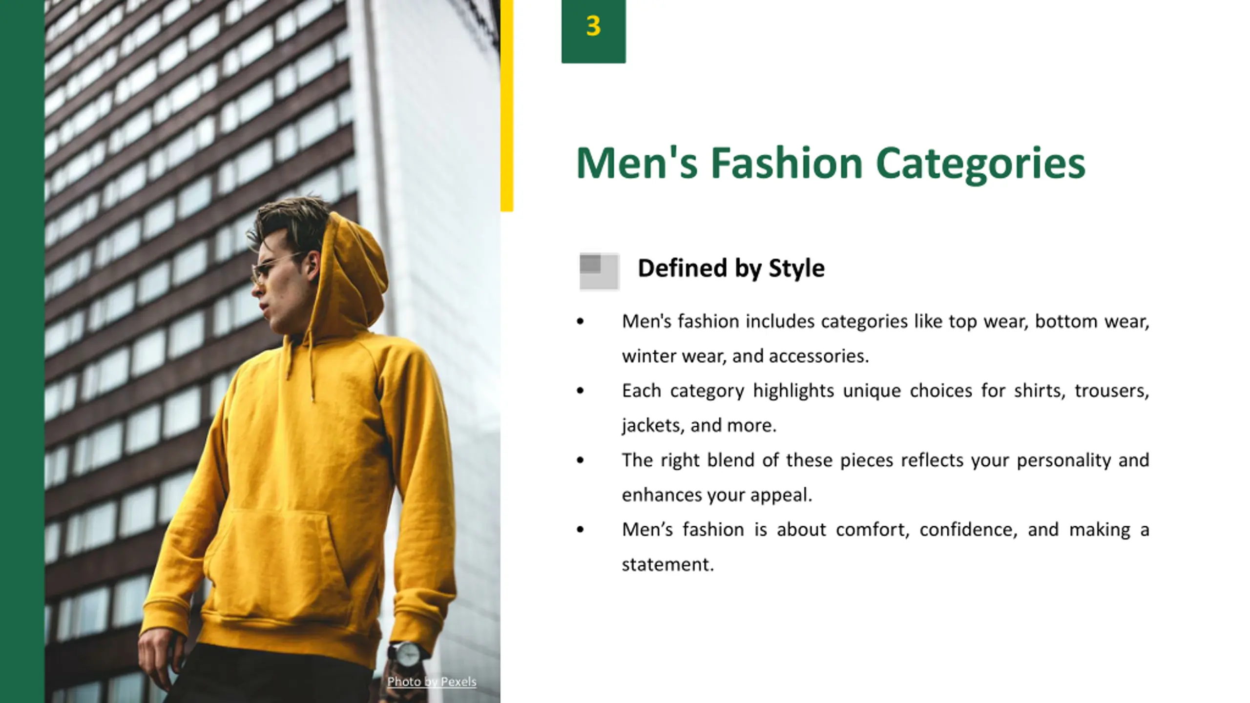 3 Men's Fashion Categories Defined by Style Men's fashion includes categories like top wear, bottom wear, winter wear, and accessories. Each category highlights unique choices for shirts, trousers, jackets, and more. The right blend of these pieces reflects your personality and enhances your appeal. Men s fashion is about comfort, confidence, and making a statement. Photo by Pexels