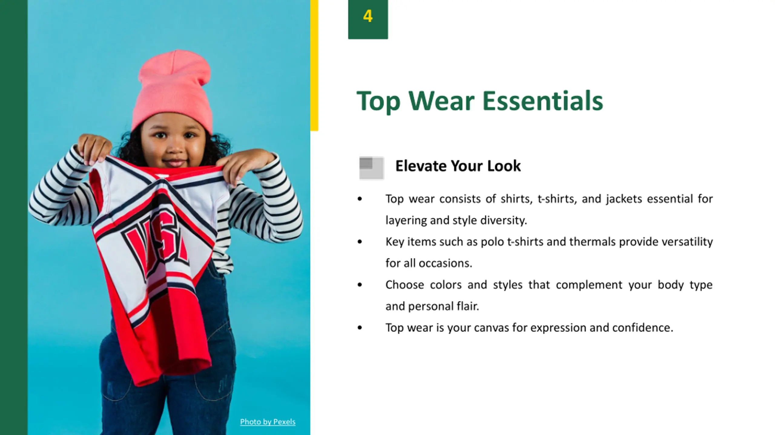 4 Top Wear Essentials Elevate Your Look Top wear consists of shirts, t-shirts, and jackets essential for layering and style diversity. Key items such as polo t-shirts and thermals provide versatility for all occasions. Choose colors and styles that complement your body type and personal flair. Top wear is your canvas for expression and confidence. Photo by Pexels