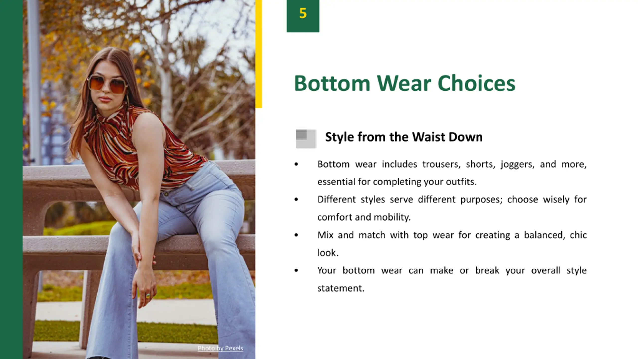 5 Bottom Wear Choices Style from the Waist Down Bottom wear includes trousers, shorts, joggers, and more, essential for completing your outfits. Different styles serve different purposes; choose wisely for comfort and mobility. Mix and match with top wear for creating a balanced, chic look. Your bottom wear can make or break your overall style statement. Photo by Pexels