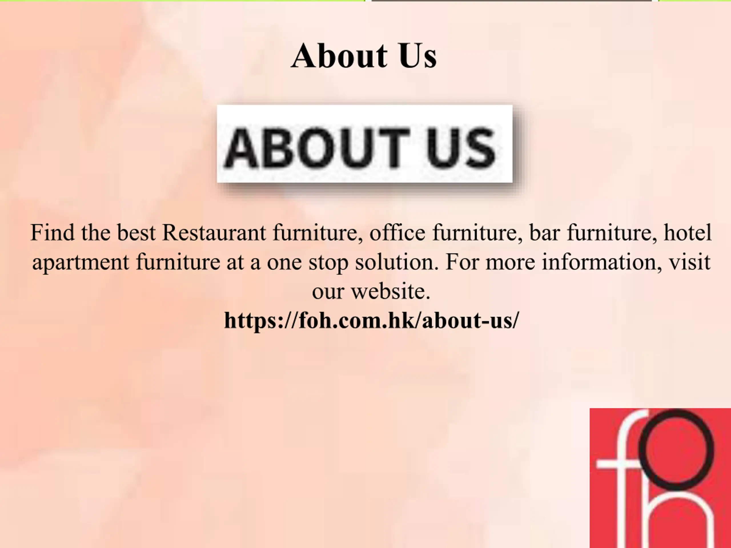 About Us Find the best Restaurant furniture, office furniture, bar furniture, hotel apartment furniture at a one stop solution. For more information, visit our website. https://foh.com.hk/about-us/