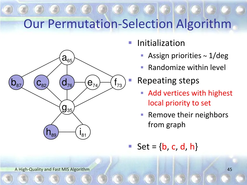 Our Permutation-Selection Algorithm Initialization Assign priorities ~ 1/deg Randomize within level Repeating steps Add vertices with highest local priority to set Remove their neighbors from graph a65 b87 c82 d76 e74 f73 g35 h89 i81 Set = {} A High-Quality and Fast MIS Algorithm 44