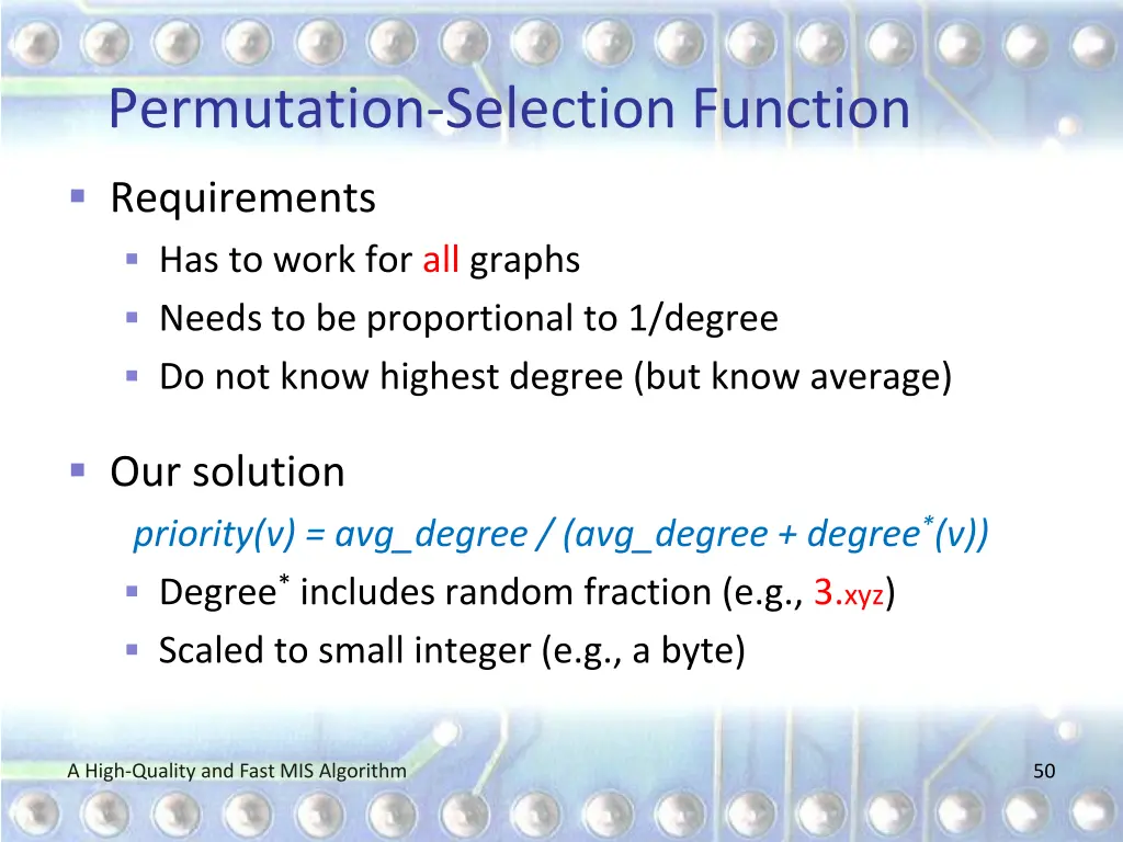 Permutation-Selection Function Requirements Has to work for all graphs Needs to be proportional to 1/degree Do not know highest degree (but know average) Our solution priority(v) = avg_degree / (avg_degree + degree*(v)) Degree* includes random fraction (e.g., 3.xyz) Scaled to small integer (e.g., a byte) A High-Quality and Fast MIS Algorithm 50