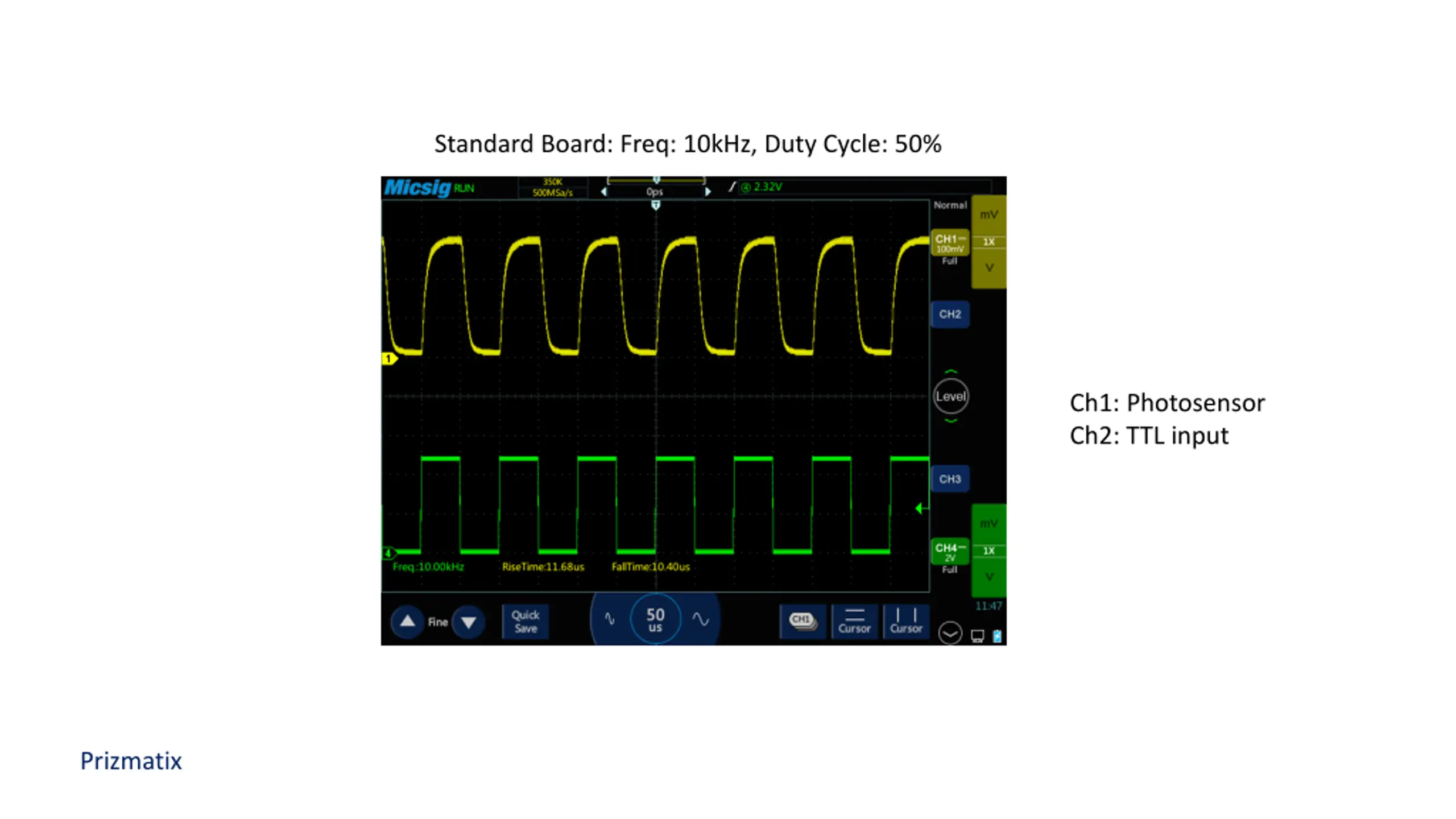 Standard Board: Freq: 10kHz, Duty Cycle: 50% Ch1: Photosensor Ch2: TTL input Prizmatix