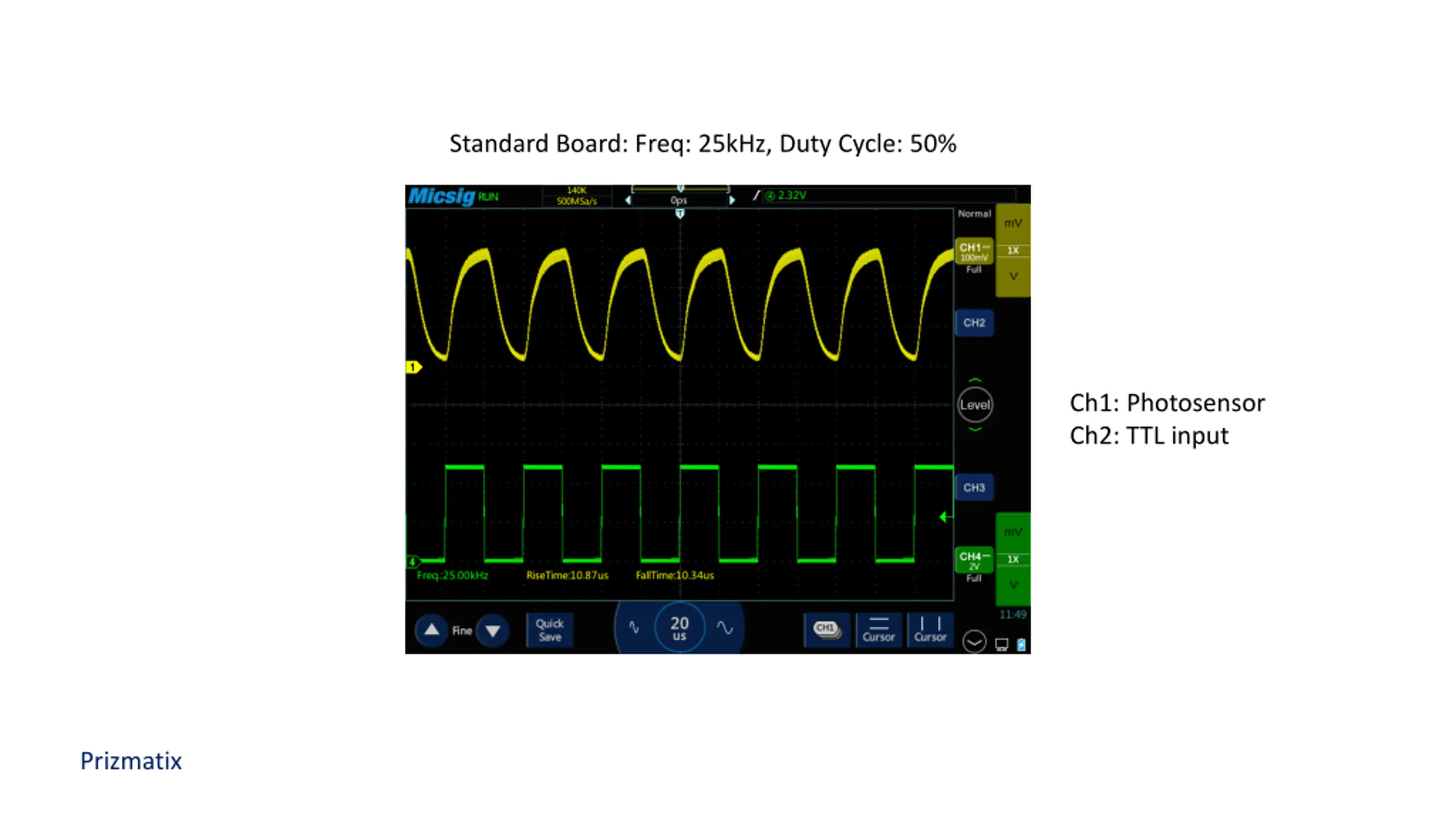 Standard Board: Freq: 25kHz, Duty Cycle: 50% Ch1: Photosensor Ch2: TTL input Prizmatix