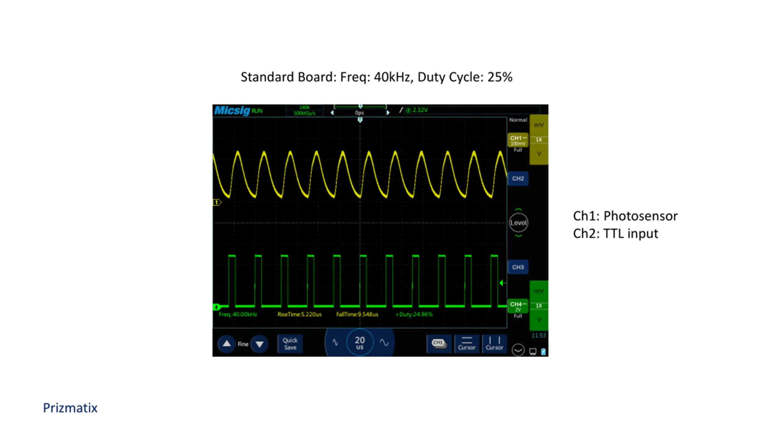 Standard Board: Freq: 40kHz, Duty Cycle: 25% Ch1: Photosensor Ch2: TTL input Prizmatix