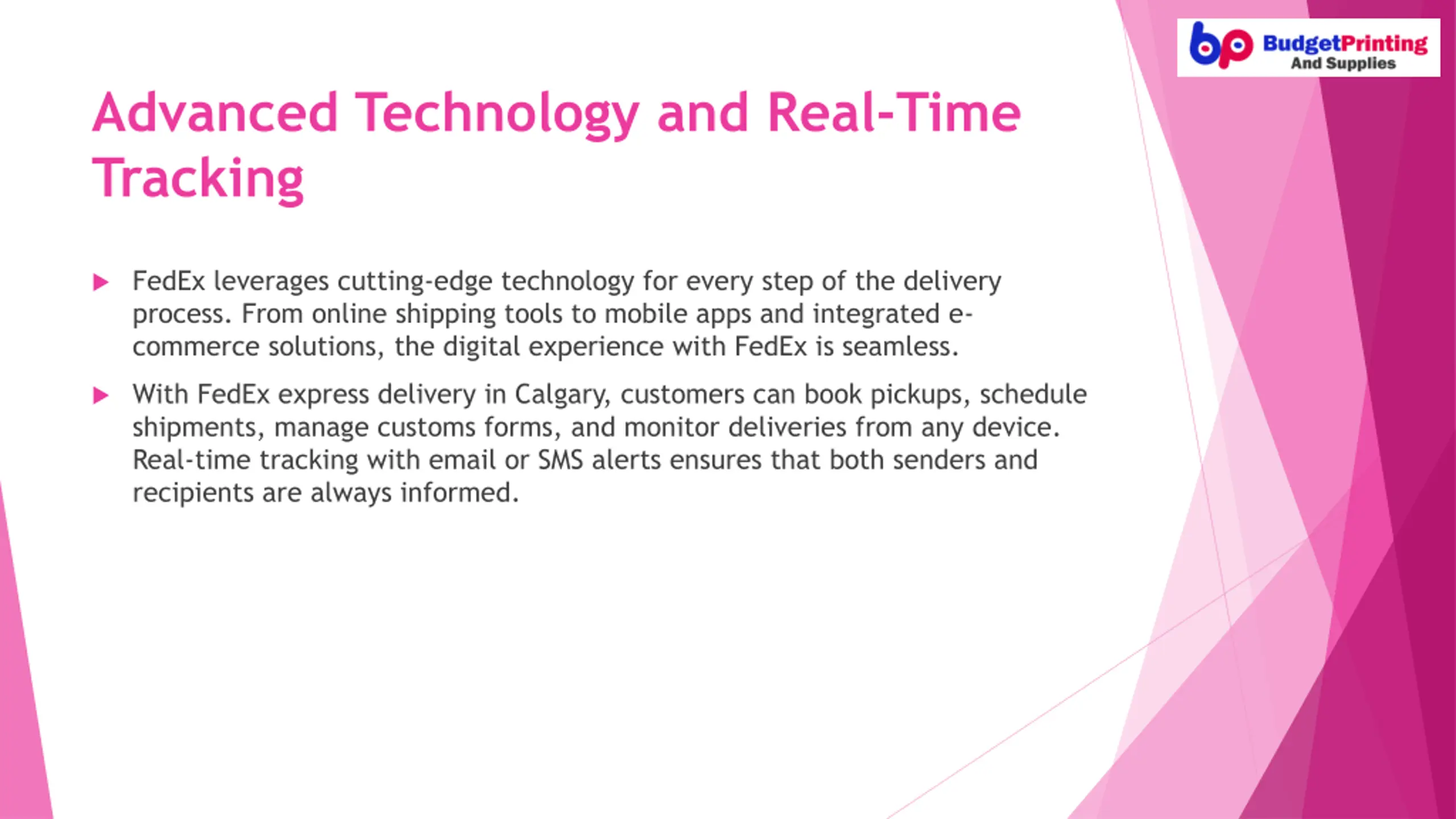 Advanced Technology and Real-Time Tracking FedEx leverages cutting-edge technology for every step of the delivery process. From online shipping tools to mobile apps and integrated e- commerce solutions, the digital experience with FedEx is seamless. With FedEx express delivery in Calgary, customers can book pickups, schedule shipments, manage customs forms, and monitor deliveries from any device. Real-time tracking with email or SMS alerts ensures that both senders and recipients are always informed.