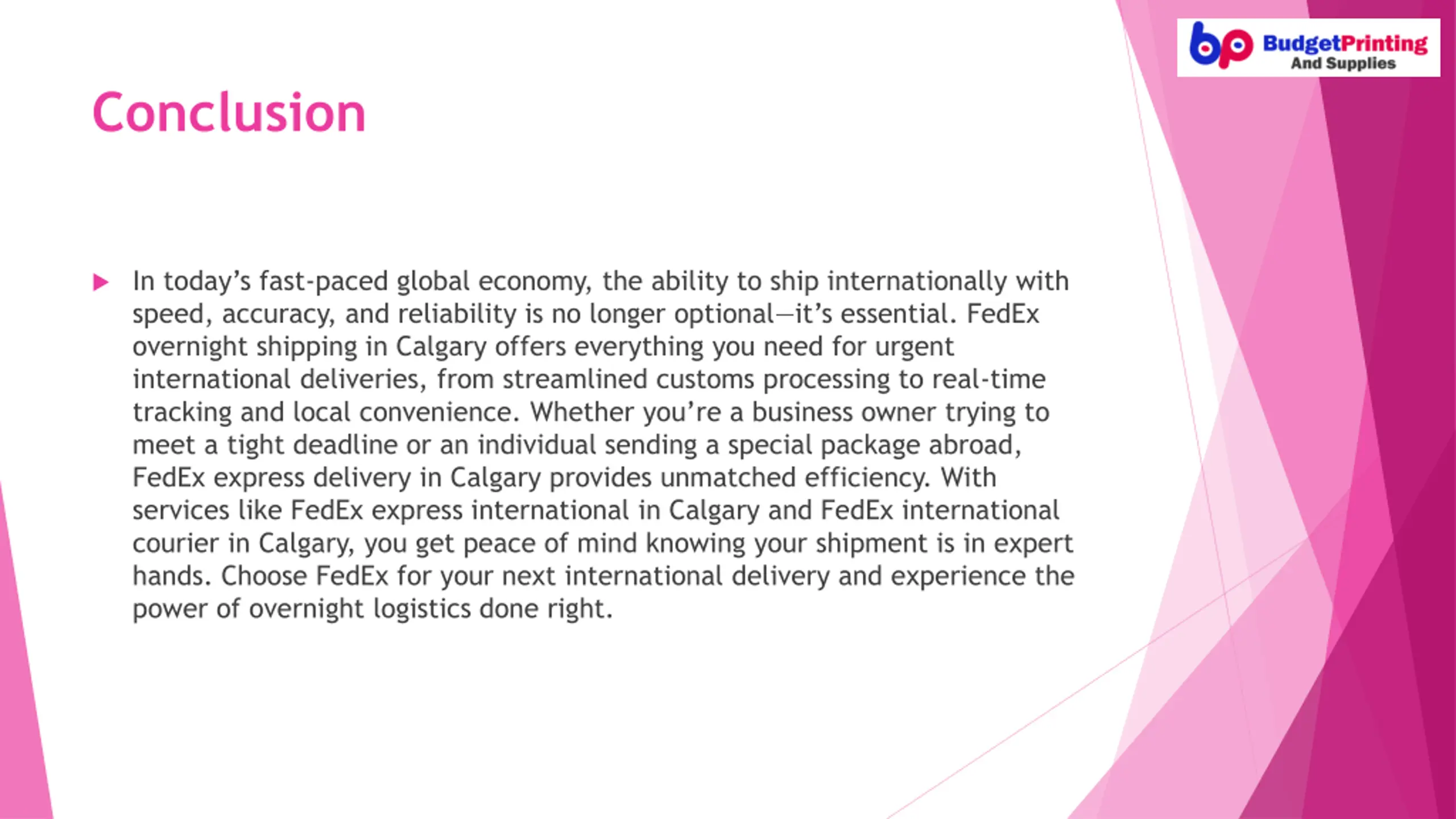 Conclusion In today s fast-paced global economy, the ability to ship internationally with speed, accuracy, and reliability is no longer optional it s essential. FedEx overnight shipping in Calgary offers everything you need for urgent international deliveries, from streamlined customs processing to real-time tracking and local convenience. Whether you re a business owner trying to meet a tight deadline or an individual sending a special package abroad, FedEx express delivery in Calgary provides unmatched efficiency. With services like FedEx express international in Calgary and FedEx international courier in Calgary, you get peace of mind knowing your shipment is in expert hands. Choose FedEx for your next international delivery and experience the power of overnight logistics done right.
