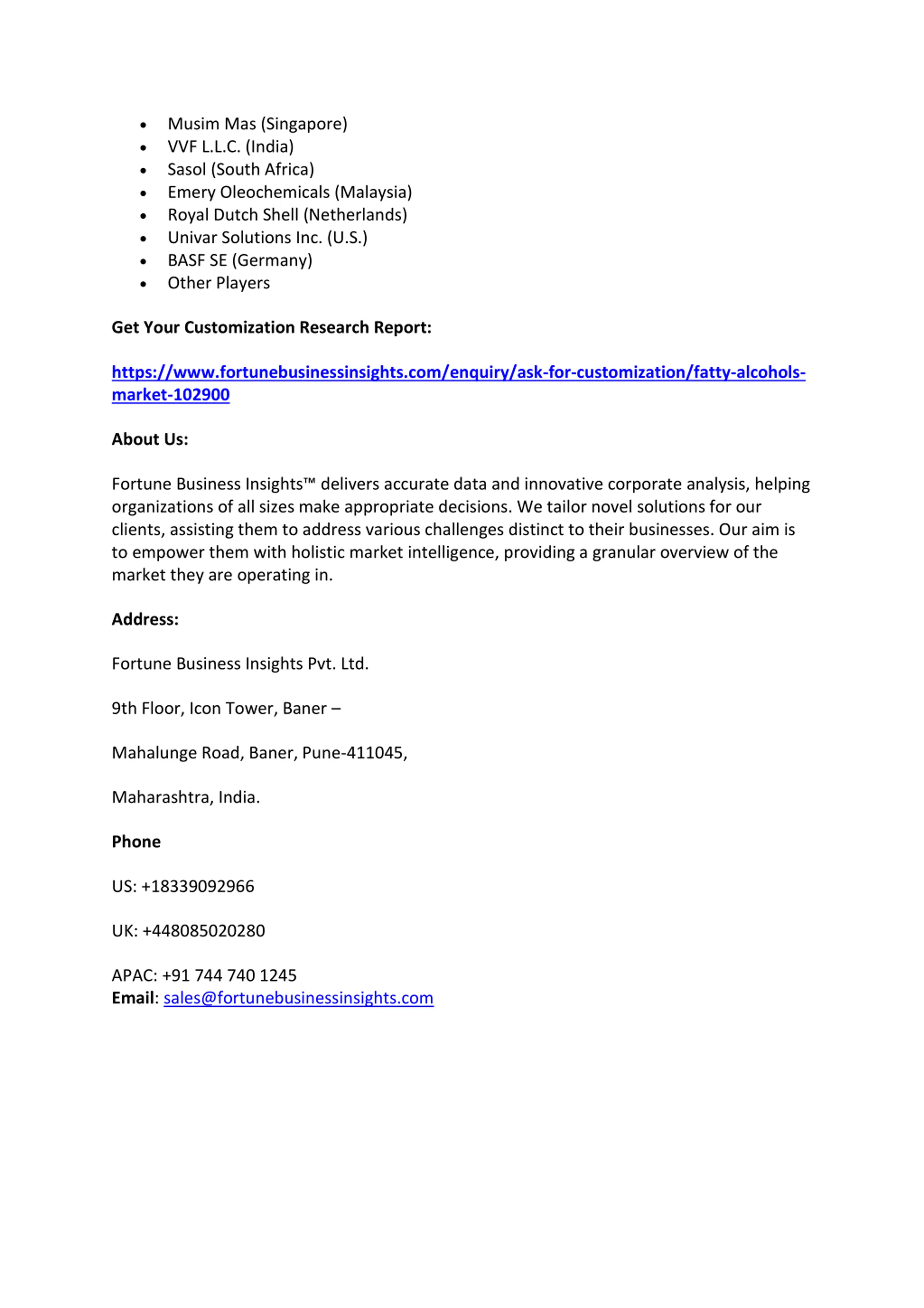 Musim Mas (Singapore) VVF L.L.C. (India) Sasol (South Africa) Emery Oleochemicals (Malaysia) Royal Dutch Shell (Netherlands) Univar Solutions Inc. (U.S.) BASF SE (Germany) Other Players Get Your Customization Research Report: https://www.fortunebusinessinsights.com/enquiry/ask-for-customization/fatty-alcohols- market-102900 About Us: Fortune Business Insights delivers accurate data and innovative corporate analysis, helping organizations of all sizes make appropriate decisions. We tailor novel solutions for our clients, assisting them to address various challenges distinct to their businesses. Our aim is to empower them with holistic market intelligence, providing a granular overview of the market they are operating in. Address: Fortune Business Insights Pvt. Ltd. 9th Floor, Icon Tower, Baner Mahalunge Road, Baner, Pune-411045, Maharashtra, India. Phone US: +18339092966 UK: +448085020280 APAC: +91 744 740 1245 Email: sales@fortunebusinessinsights.com
