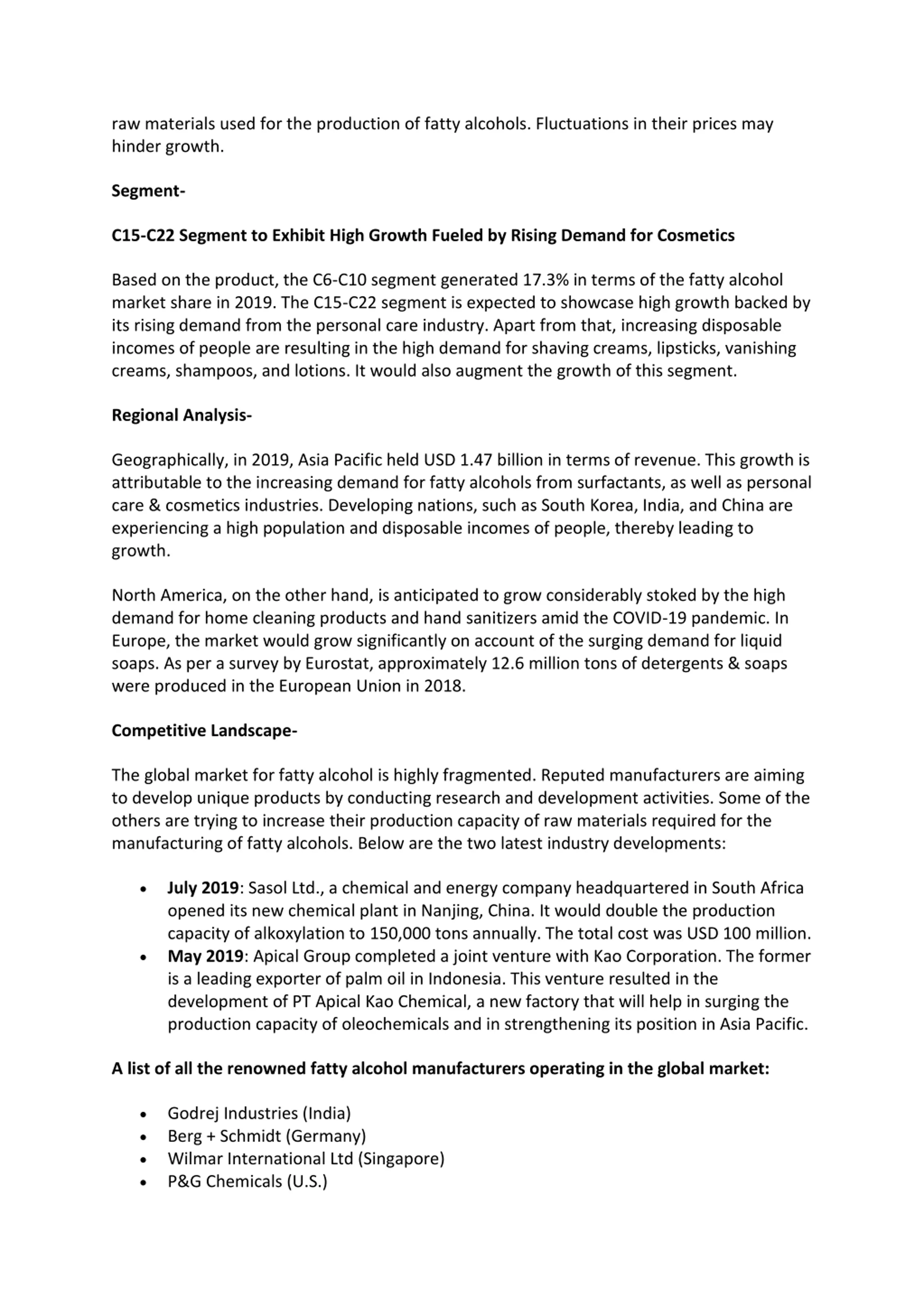 raw materials used for the production of fatty alcohols. Fluctuations in their prices may hinder growth. Segment- C15-C22 Segment to Exhibit High Growth Fueled by Rising Demand for Cosmetics Based on the product, the C6-C10 segment generated 17.3% in terms of the fatty alcohol market share in 2019. The C15-C22 segment is expected to showcase high growth backed by its rising demand from the personal care industry. Apart from that, increasing disposable incomes of people are resulting in the high demand for shaving creams, lipsticks, vanishing creams, shampoos, and lotions. It would also augment the growth of this segment. Regional Analysis- Geographically, in 2019, Asia Pacific held USD 1.47 billion in terms of revenue. This growth is attributable to the increasing demand for fatty alcohols from surfactants, as well as personal care & cosmetics industries. Developing nations, such as South Korea, India, and China are experiencing a high population and disposable incomes of people, thereby leading to growth. North America, on the other hand, is anticipated to grow considerably stoked by the high demand for home cleaning products and hand sanitizers amid the COVID-19 pandemic. In Europe, the market would grow significantly on account of the surging demand for liquid soaps. As per a survey by Eurostat, approximately 12.6 million tons of detergents & soaps were produced in the European Union in 2018. Competitive Landscape- The global market for fatty alcohol is highly fragmented. Reputed manufacturers are aiming to develop unique products by conducting research and development activities. Some of the others are trying to increase their production capacity of raw materials required for the manufacturing of fatty alcohols. Below are the two latest industry developments: July 2019: Sasol Ltd., a chemical and energy company headquartered in South Africa opened its new chemical plant in Nanjing, China. It would double the production capacity of alkoxylation to 150,000 tons annually. The total cost was USD 100 million. May 2019: Apical Group completed a joint venture with Kao Corporation. The former is a leading exporter of palm oil in Indonesia. This venture resulted in the development of PT Apical Kao Chemical, a new factory that will help in surging the production capacity of oleochemicals and in strengthening its position in Asia Pacific. A list of all the renowned fatty alcohol manufacturers operating in the global market: Godrej Industries (India) Berg + Schmidt (Germany) Wilmar International Ltd (Singapore) P&G Chemicals (U.S.)