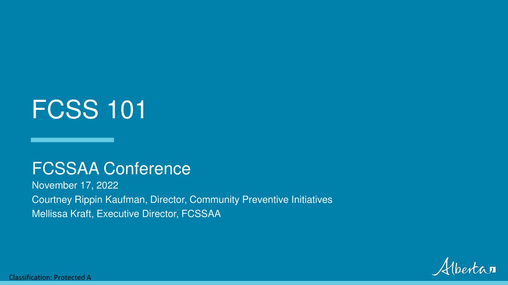 FCSS 101 FCSSAA Conference November 17, 2022 Courtney Rippin Kaufman, Director, Community Preventive Initiatives Mellissa Kraft, Executive Director, FCSSAA Classification: Protected A