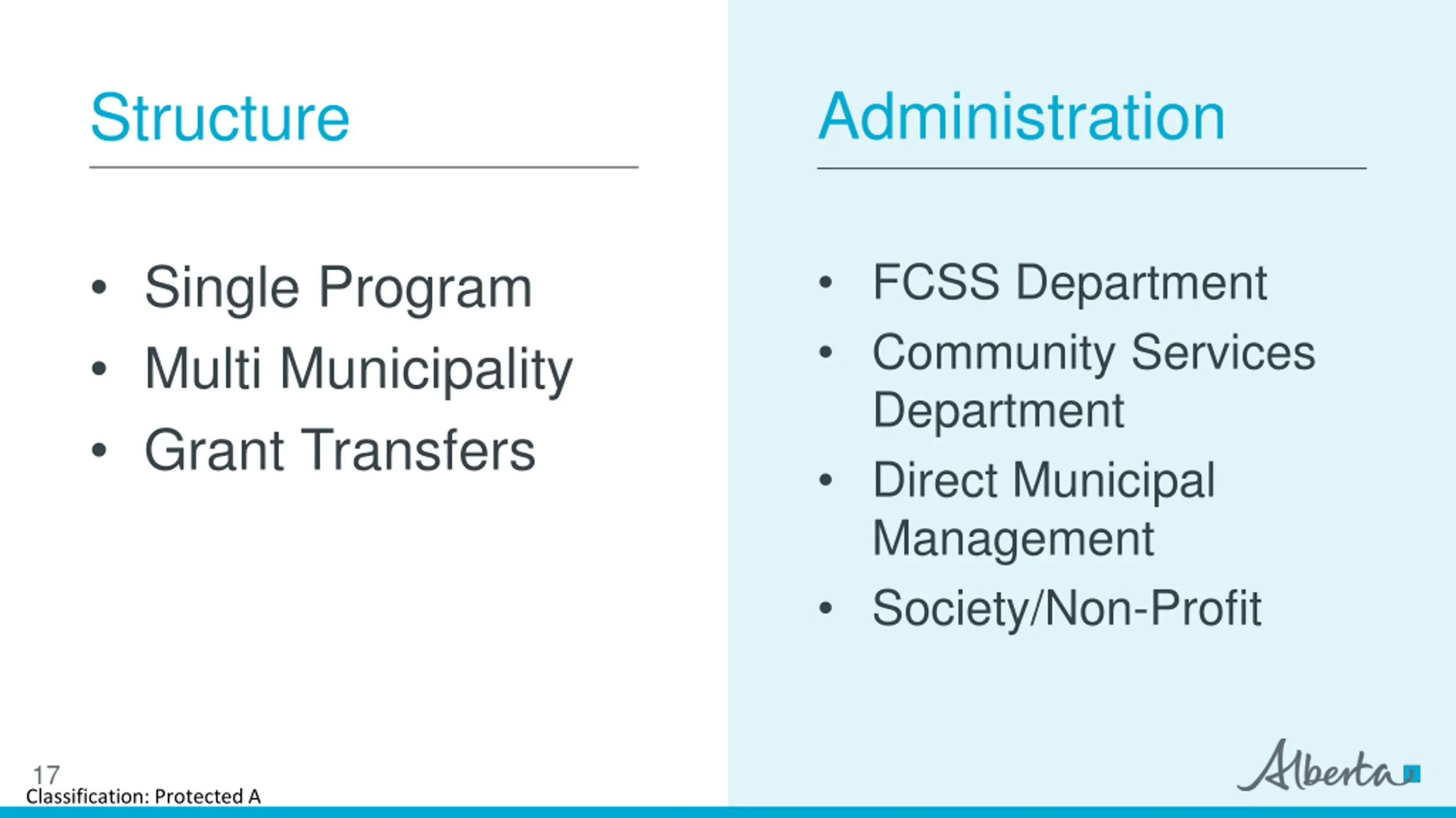 FCSS Administration Program Structure and Municipal Responsibilities 16 Classification: Protected A
