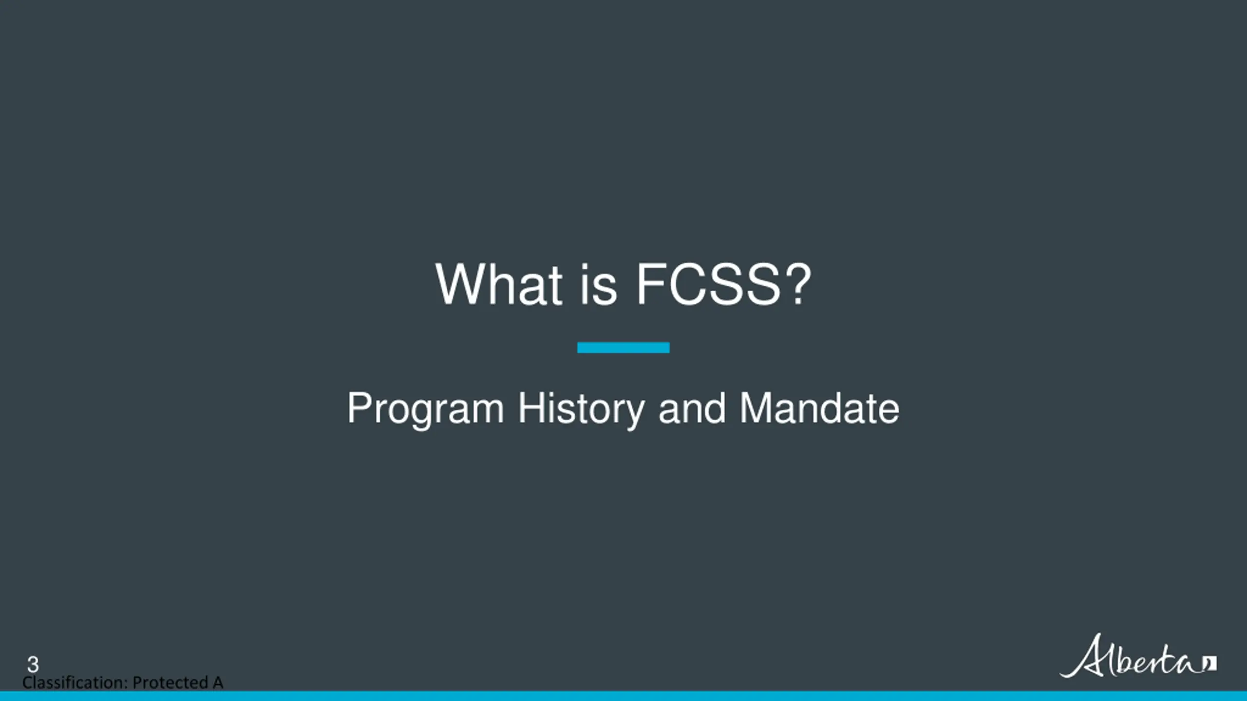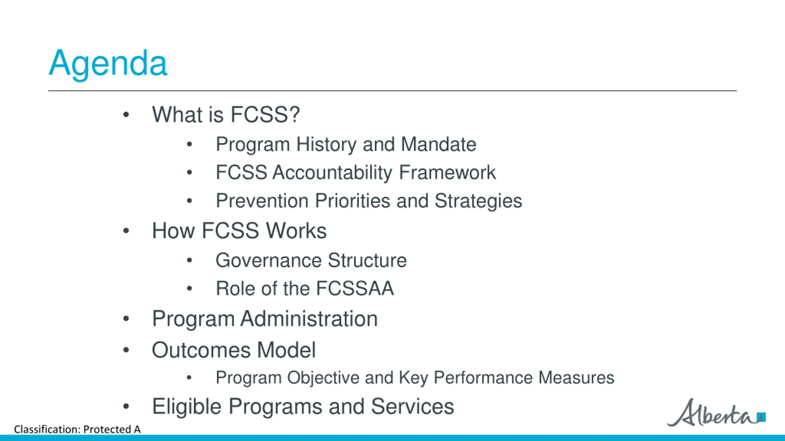 Agenda What is FCSS? Program History and Mandate FCSS Accountability Framework Prevention Priorities and Strategies How FCSS Works Governance Structure Role of the FCSSAA Program Administration Outcomes Model Program Objective and Key Performance Measures Eligible Programs and Services Classification: Protected A