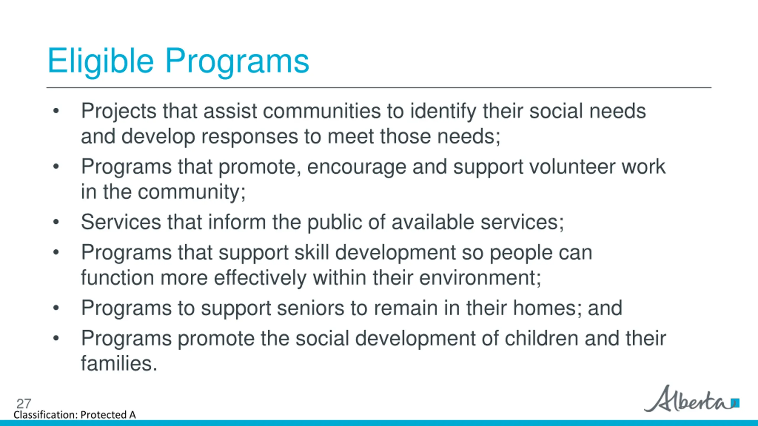 Program Requirements and Eligibility Must be preventive, enhance the well-being of individuals and families, and contribute to one or more of the following: Help people develop independence, strengthen coping skills, and become more resilient to crisis; Help people develop an awareness of social needs; Help people develop interpersonal and group skills that enhance relationships; Help people and communities assume responsibility for decisions and actions that affect them; and Support people to be active participants in their community 26 Classification: Protected A