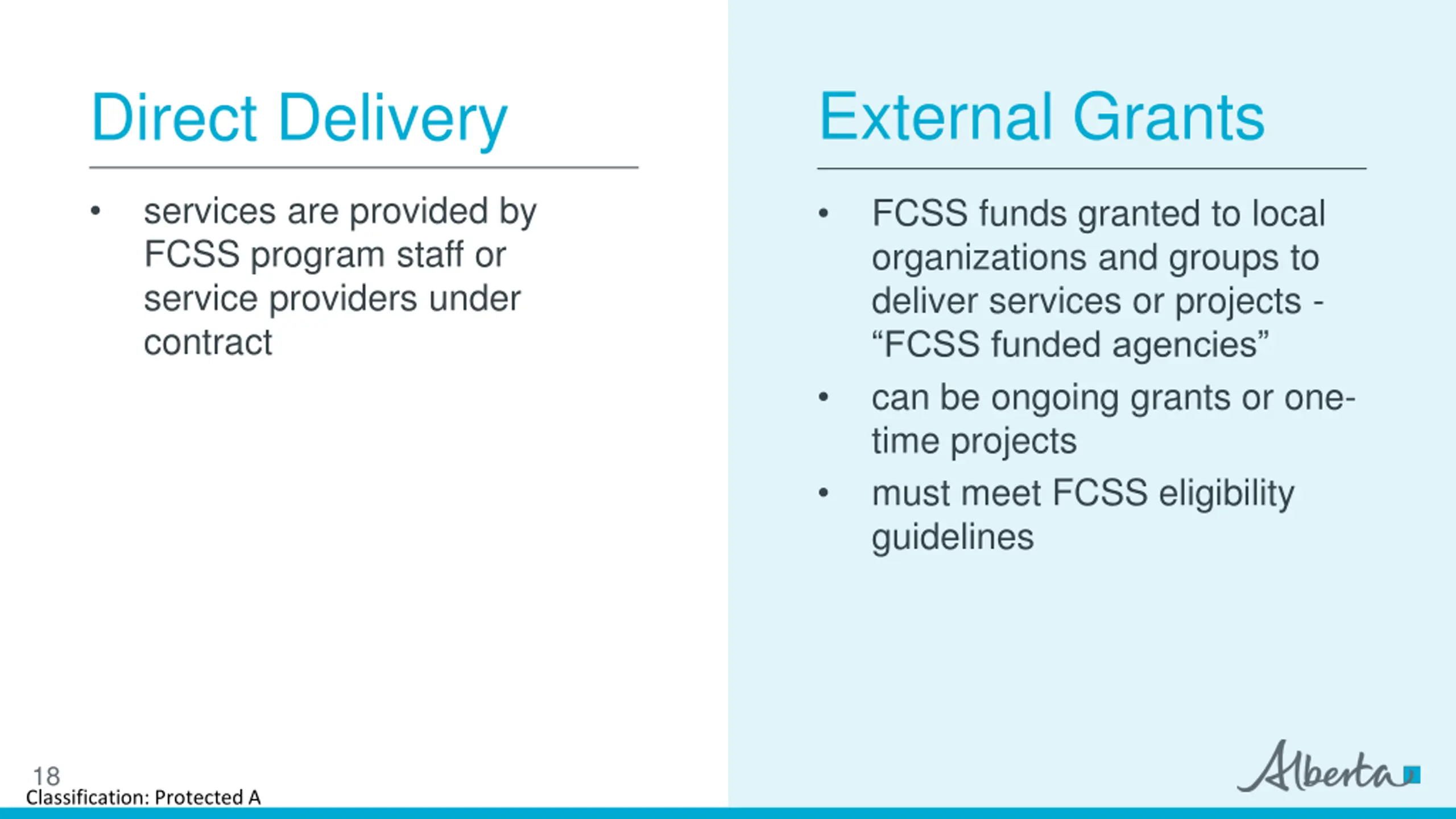 External Grants Direct Delivery services are provided by FCSS program staff or service providers under contract FCSS funds granted to local organizations and groups to deliver services or projects - FCSS funded agencies can be ongoing grants or one- time projects must meet FCSS eligibility guidelines 18 Classification: Protected A