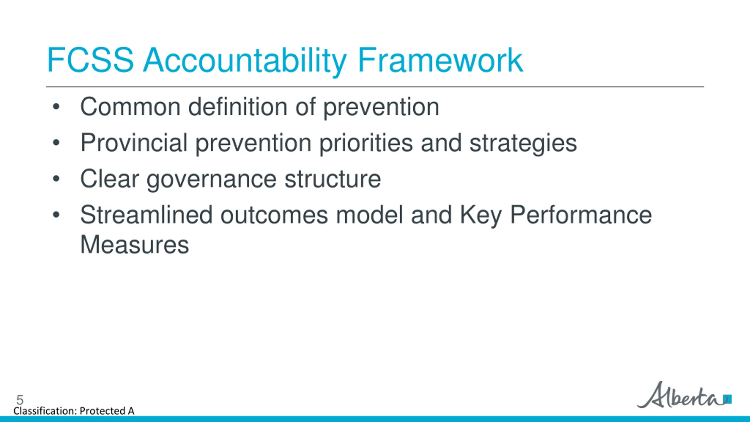 FCSS History and Mandate Program started in 1966 80/20 Partnership Voluntary Participation FCSS Act and Regulation Mandate and Requirements Responsibilities and funding parameters Emphasis on Prevention Focus on Volunteerism 4 Classification: Protected A