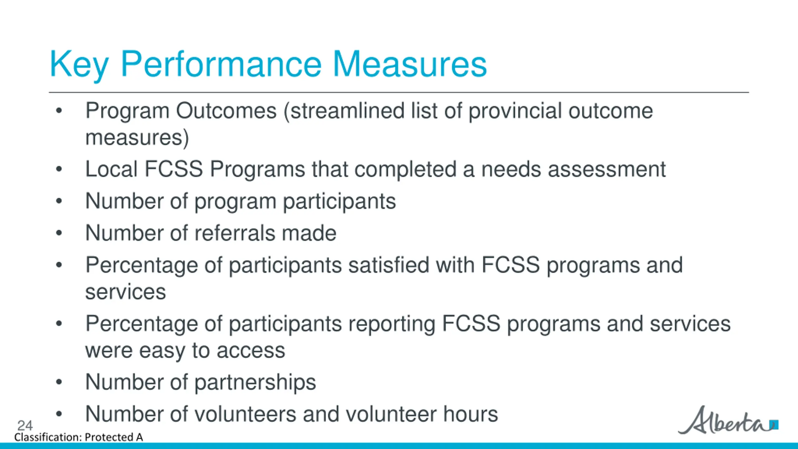 Key Performance Measures Program Outcomes (streamlined list of provincial outcome measures) Local FCSS Programs that completed a needs assessment Number of program participants Number of referrals made Percentage of participants satisfied with FCSS programs and services Percentage of participants reporting FCSS programs and services were easy to access Number of partnerships Number of volunteers and volunteer hours 24 Classification: Protected A