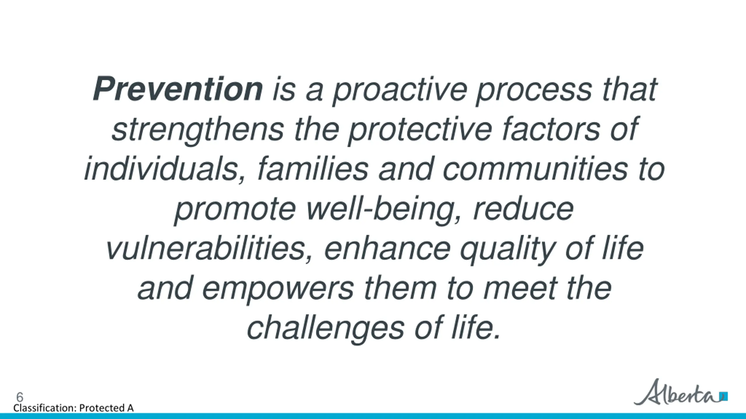 Prevention is a proactive process that strengthens the protective factors of individuals, families and communities to promote well-being, reduce vulnerabilities, enhance quality of life and empowers them to meet the challenges of life. 6 Classification: Protected A