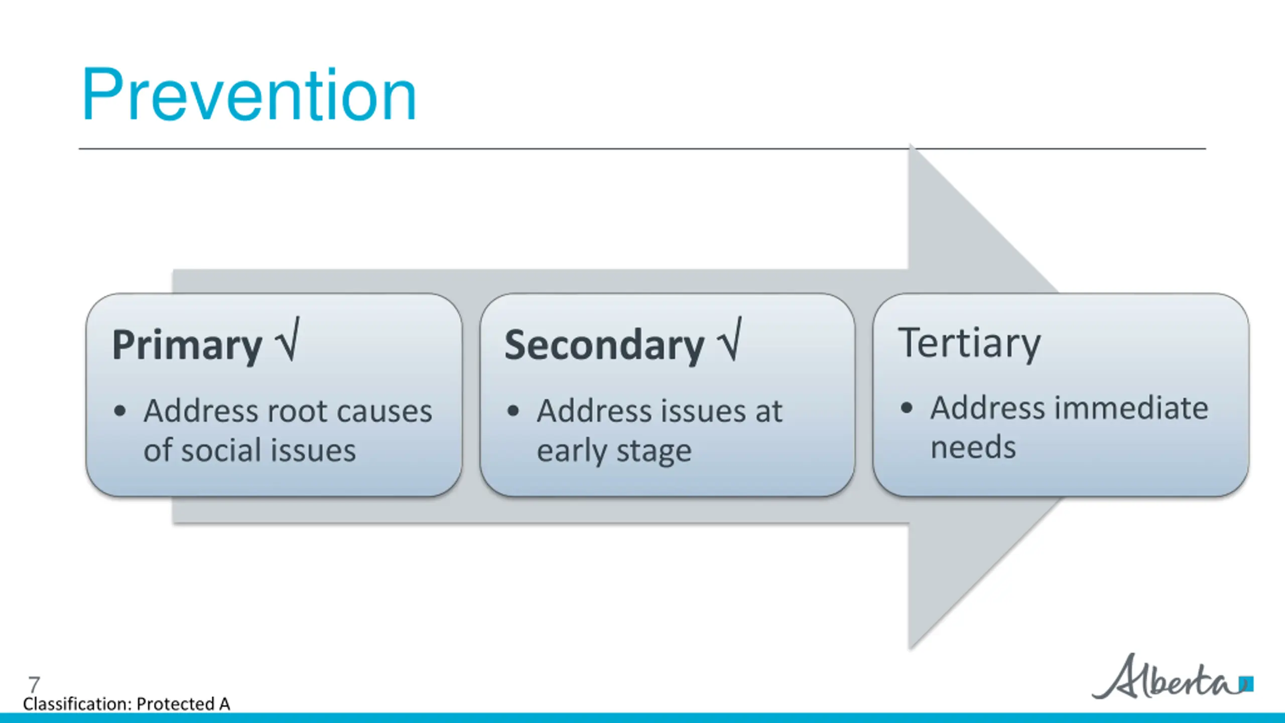 Prevention Primary Secondary Tertiary Address immediate needs Address root causes of social issues Address issues at early stage 7 Classification: Protected A