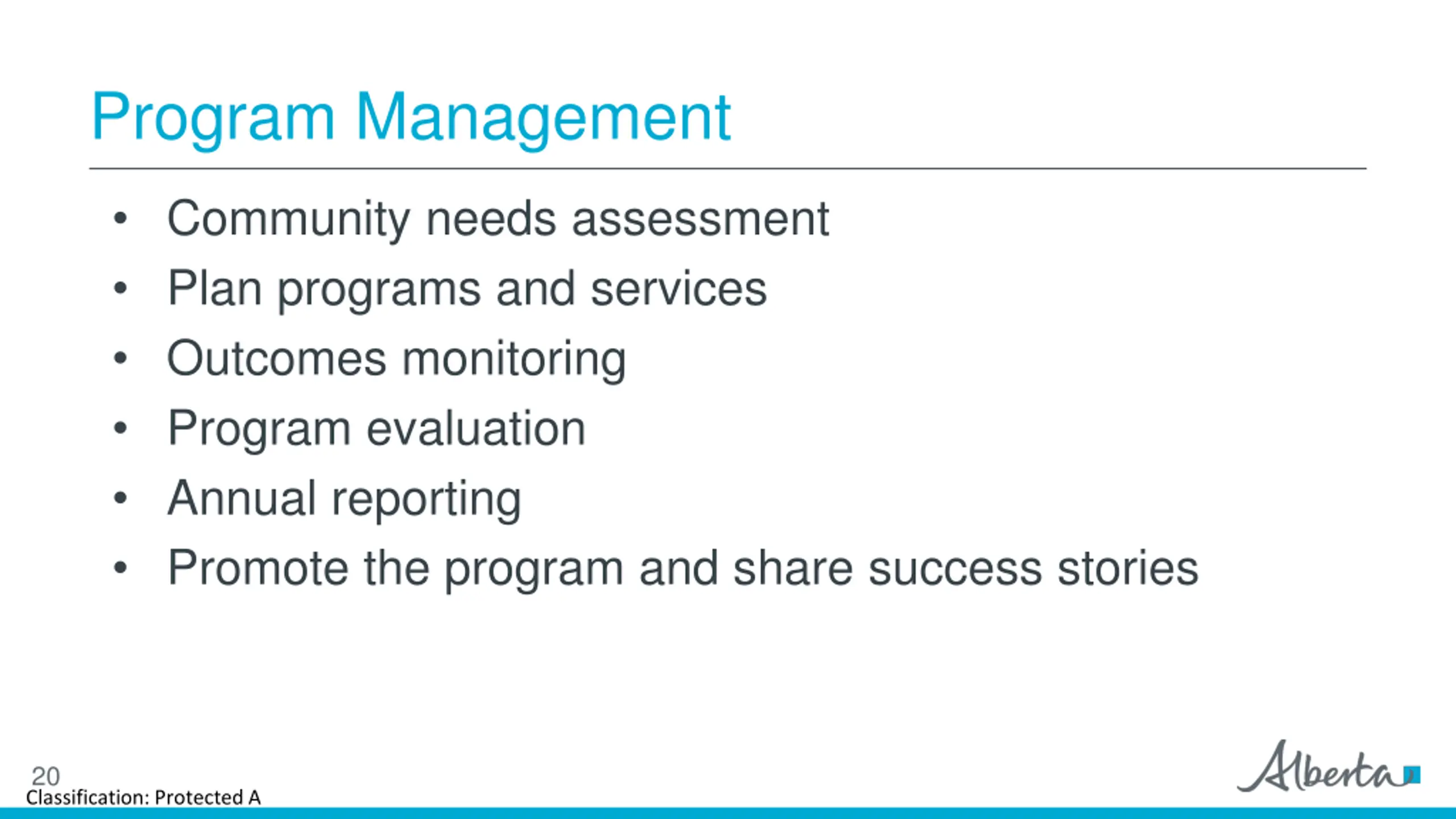 Program Management Community needs assessment Plan programs and services Outcomes monitoring Program evaluation Annual reporting Promote the program and share success stories 20 Classification: Protected A