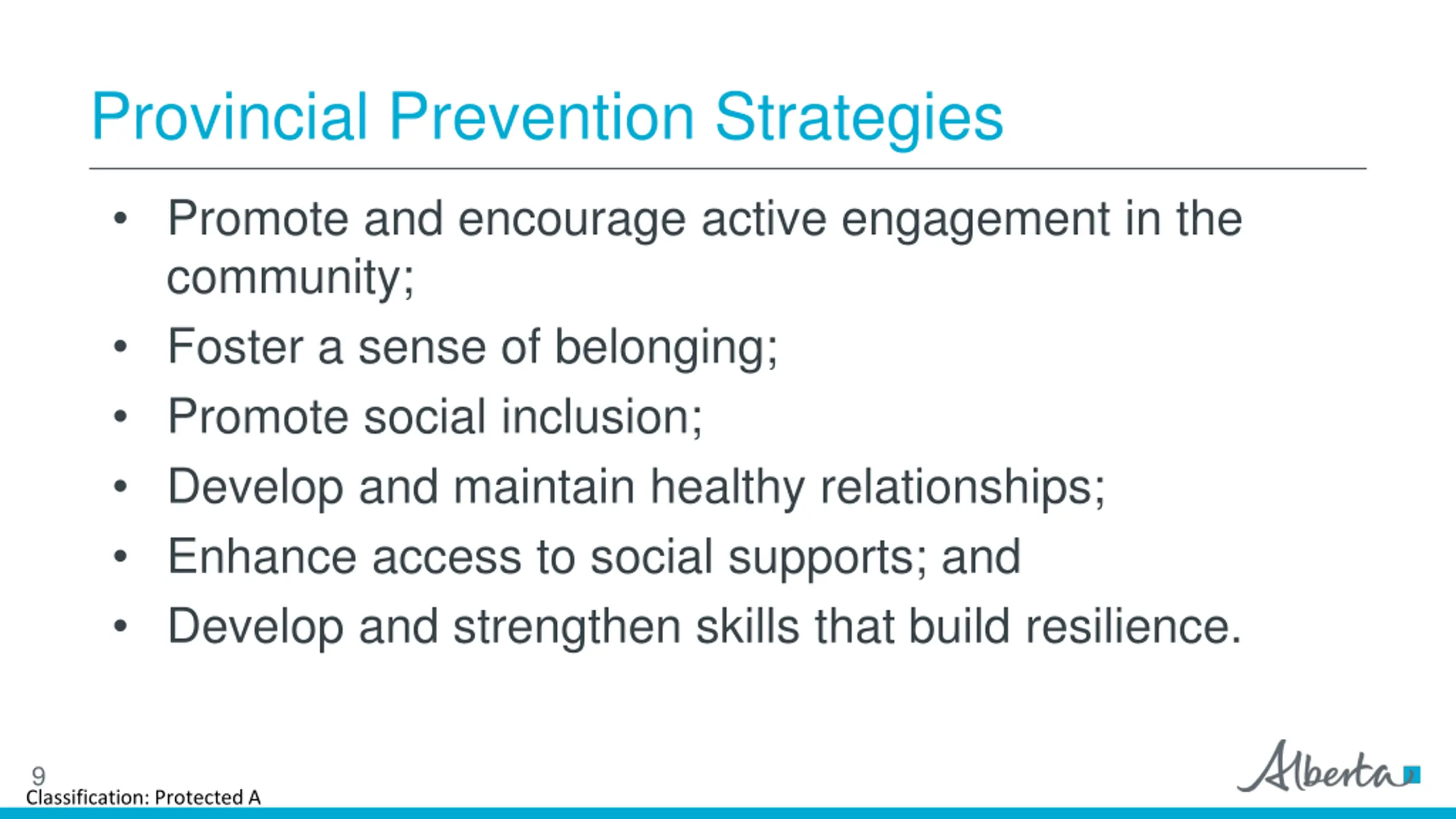 Provincial Prevention Strategies Promote and encourage active engagement in the community; Foster a sense of belonging; Promote social inclusion; Develop and maintain healthy relationships; Enhance access to social supports; and Develop and strengthen skills that build resilience. 9 Classification: Protected A