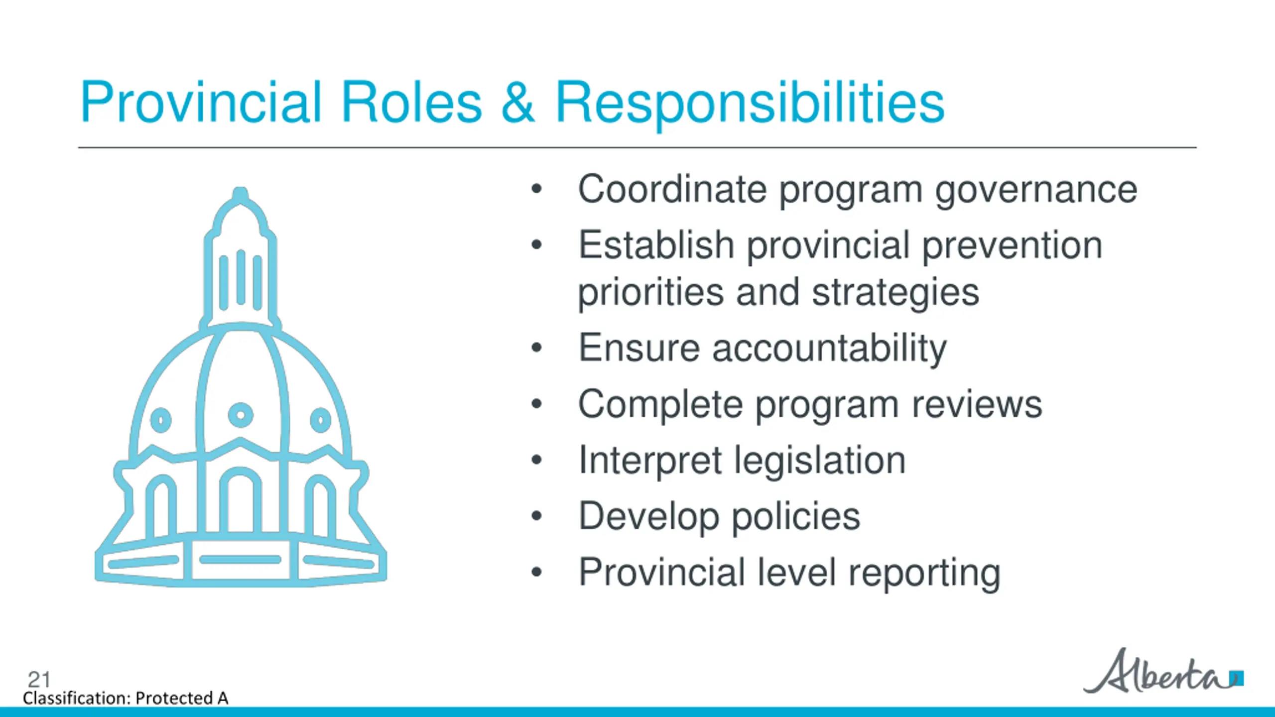 Provincial Roles & Responsibilities Coordinate program governance Establish provincial prevention priorities and strategies Ensure accountability Complete program reviews Interpret legislation Develop policies Provincial level reporting 21 Classification: Protected A