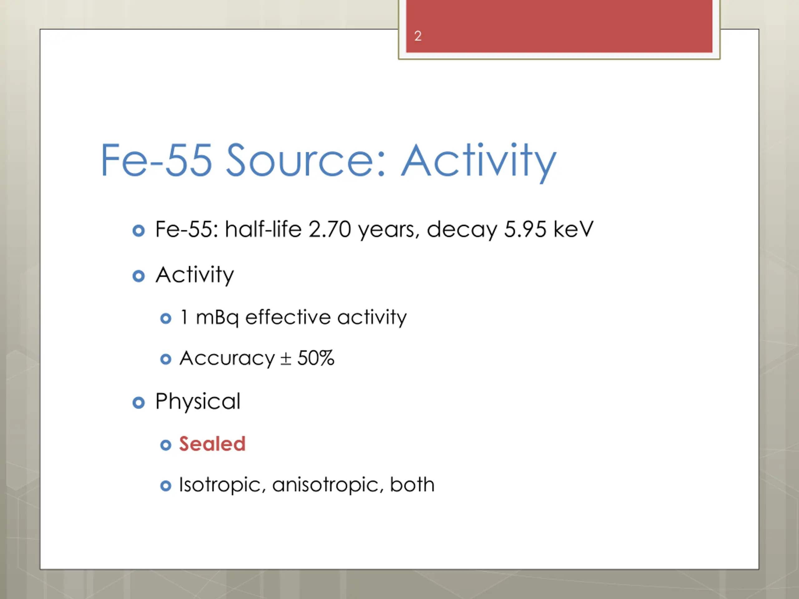 2 Fe-55 Source: Activity Fe-55: half-life 2.70 years, decay 5.95 keV Activity 1 mBq effective activity Accuracy 50% Physical Sealed Isotropic, anisotropic, both