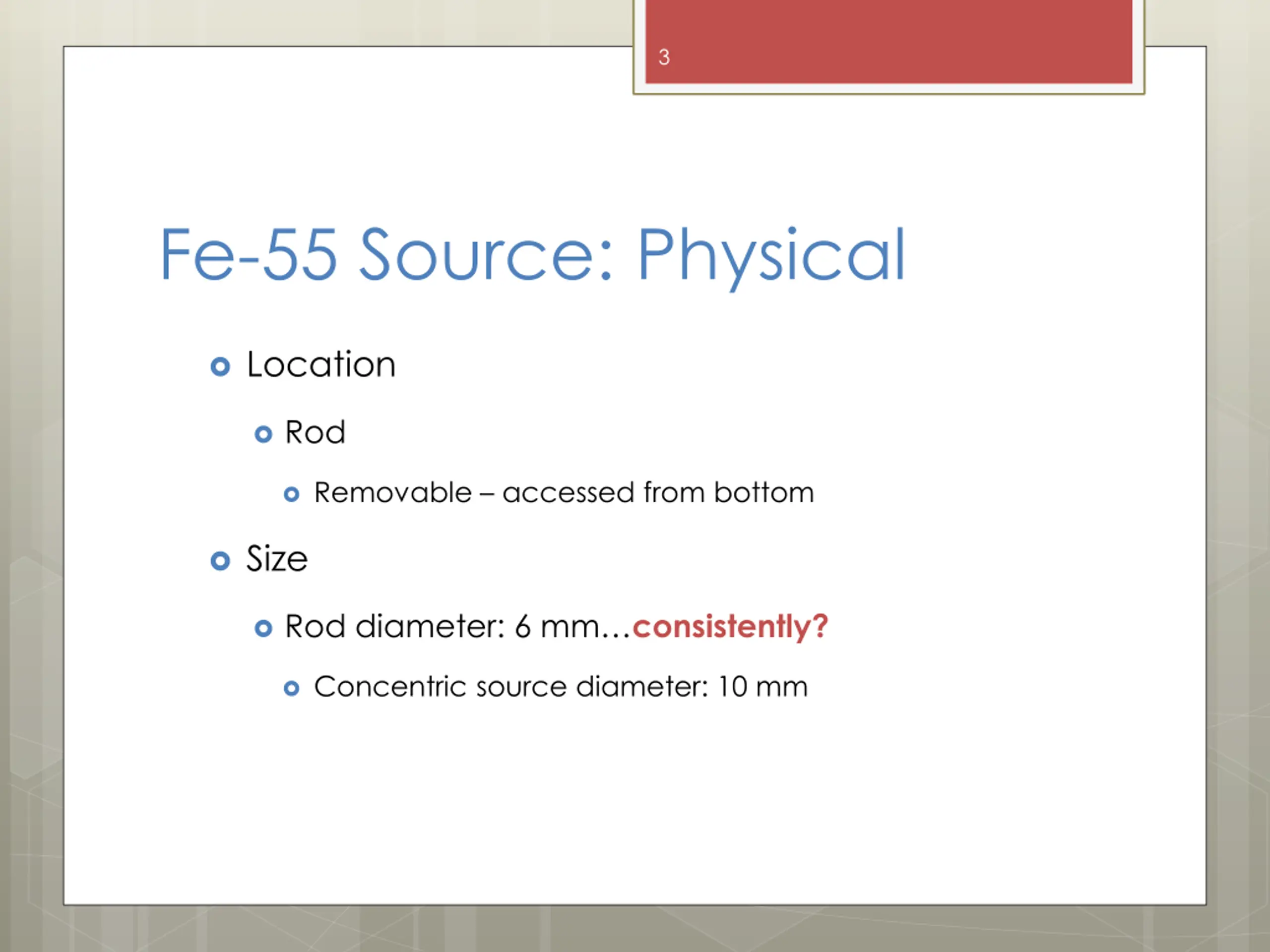 3 Fe-55 Source: Physical Location Rod Removable accessed from bottom Size Rod diameter: 6 mm consistently? Concentric source diameter: 10 mm