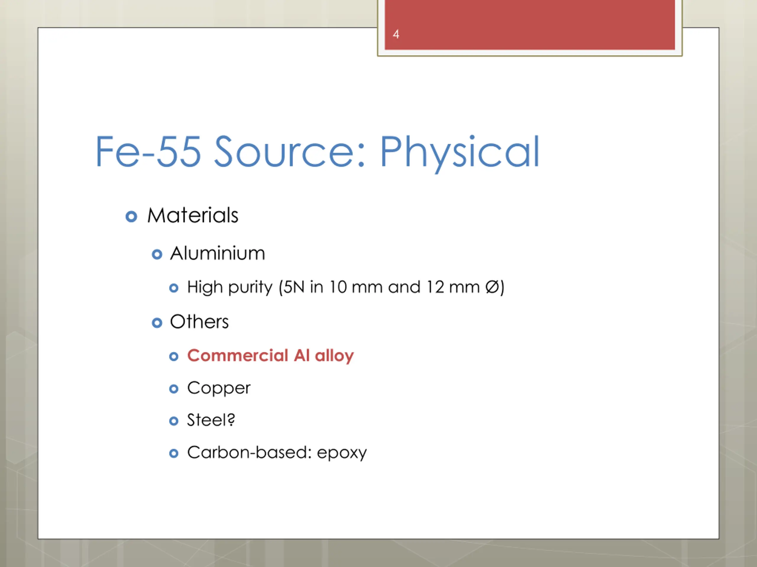 4 Fe-55 Source: Physical Materials Aluminium High purity (5N in 10 mm and 12 mm ) Others Commercial Al alloy Copper Steel? Carbon-based: epoxy