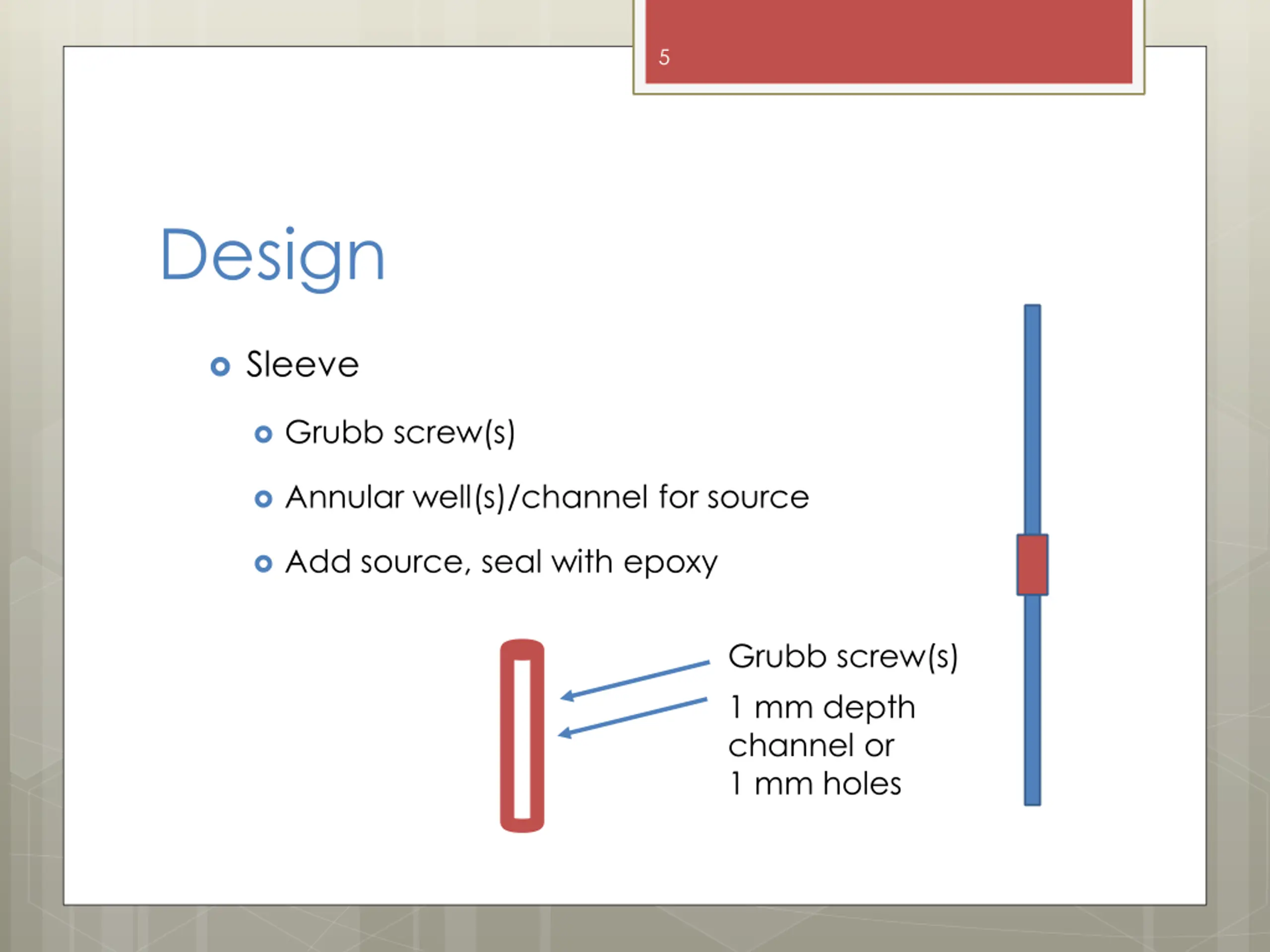5 Design Sleeve Grubb screw(s) Annular well(s)/channel for source Add source, seal with epoxy Grubb screw(s) 1 mm depth channel or 1 mm holes