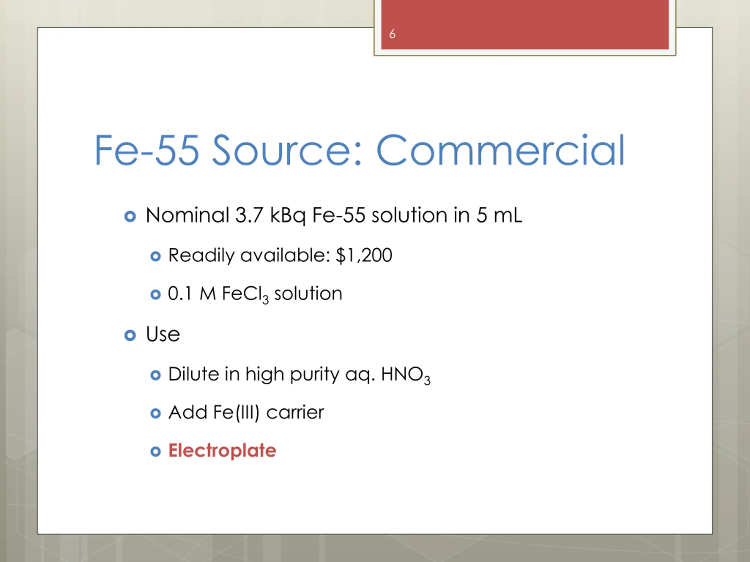 6 Fe-55 Source: Commercial Nominal 3.7 kBq Fe-55 solution in 5 mL Readily available: $1,200 0.1 M FeCl3 solution Use Dilute in high purity aq. HNO3 Add Fe(III) carrier Electroplate