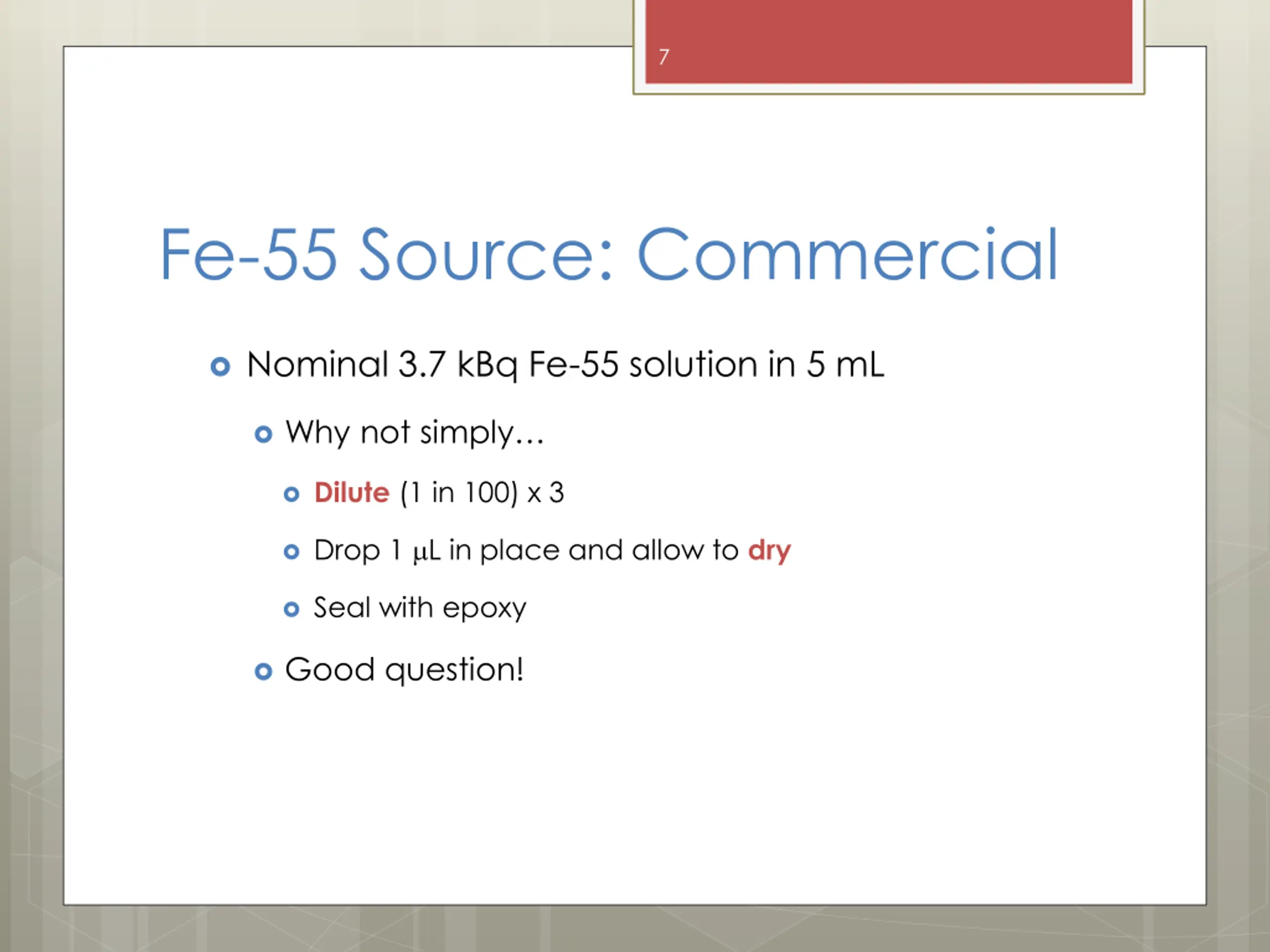 7 Fe-55 Source: Commercial Nominal 3.7 kBq Fe-55 solution in 5 mL Why not simply Dilute (1 in 100) x 3 Drop 1 L in place and allow to dry Seal with epoxy Good question!