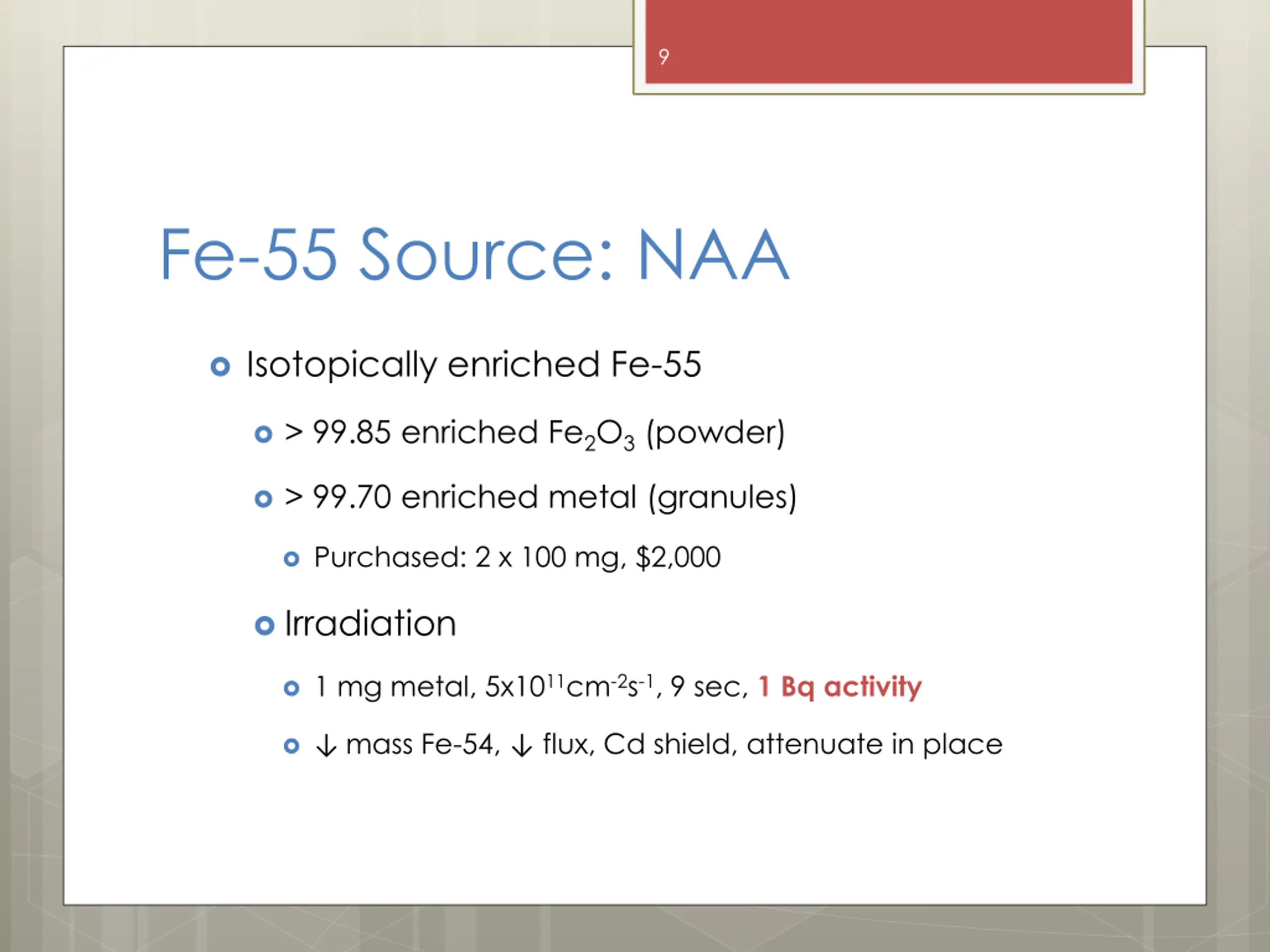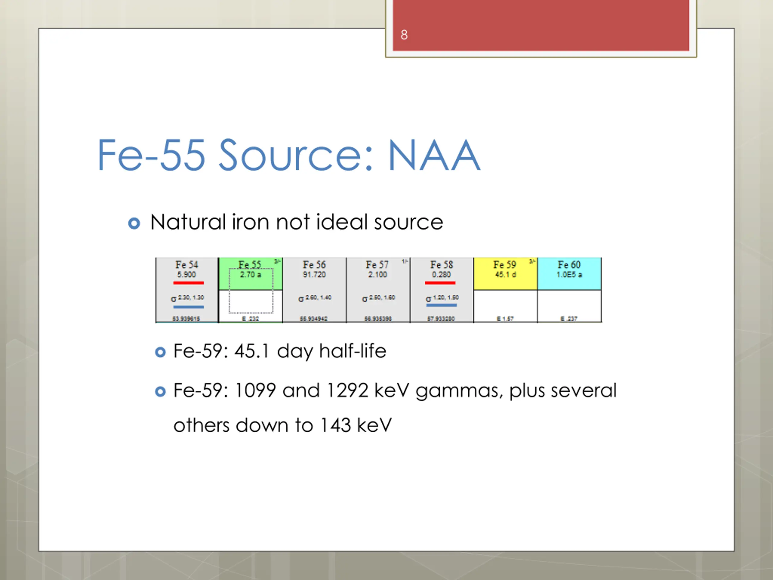 8 Fe-55 Source: NAA Natural iron not ideal source Fe-59: 45.1 day half-life Fe-59: 1099 and 1292 keV gammas, plus several others down to 143 keV