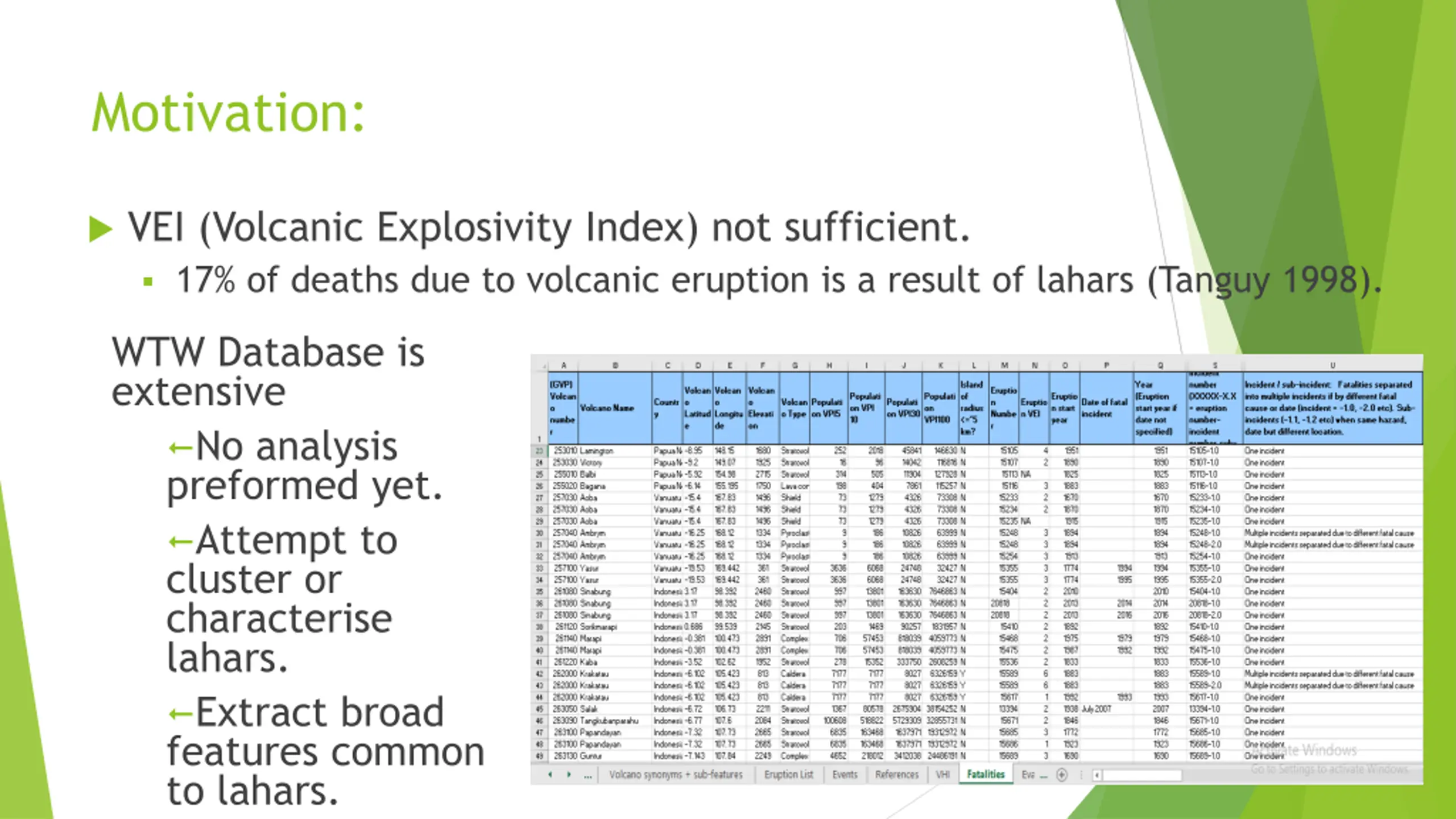 Motivation: VEI (Volcanic Explosivity Index) not sufficient. 17% of deaths due to volcanic eruption is a result of lahars (Tanguy 1998). WTW Database is extensive No analysis preformed yet. Attempt to cluster or characterise lahars. Extract broad features common to lahars.