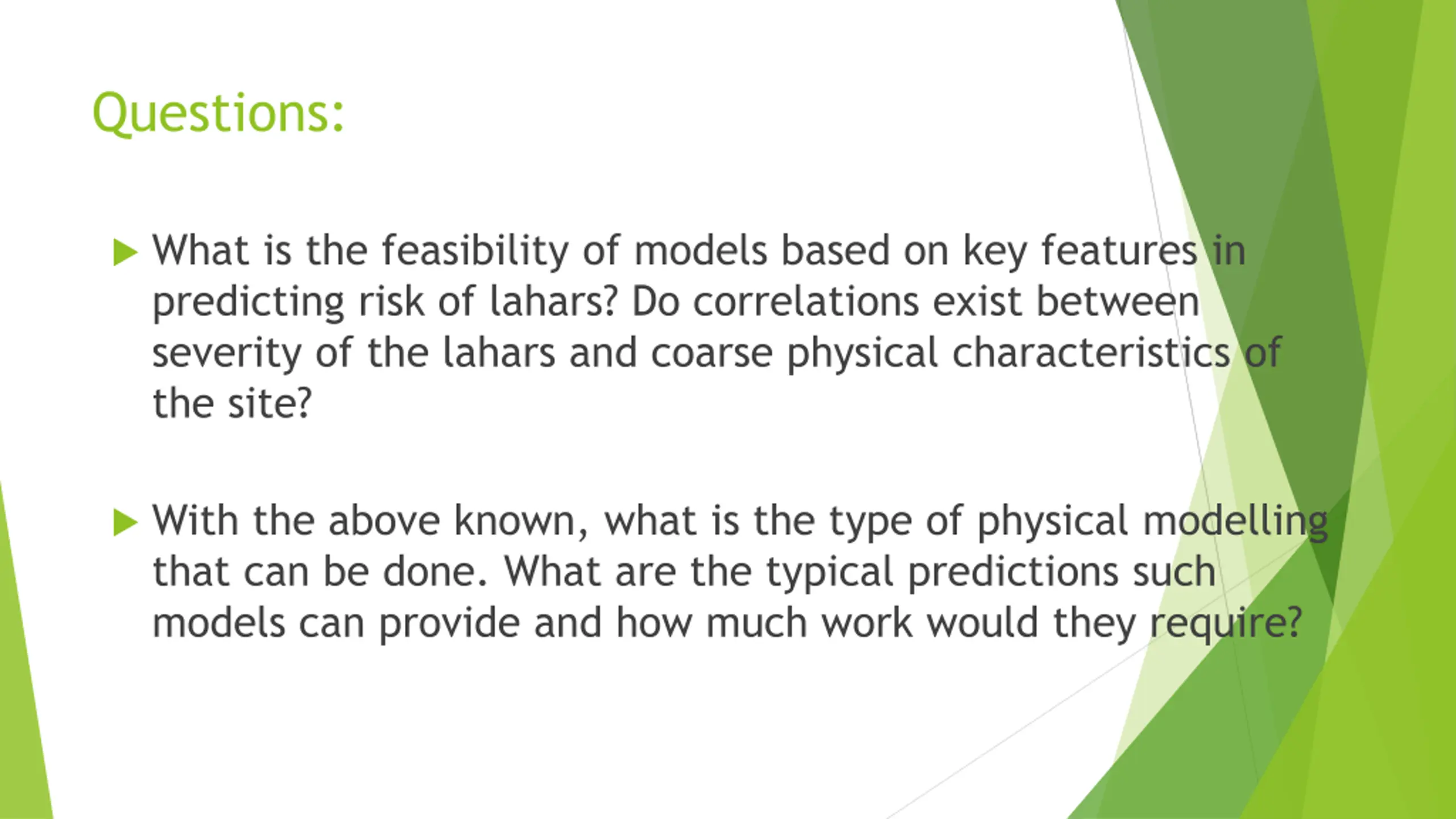 Questions: What is the feasibility of models based on key features in predicting risk of lahars? Do correlations exist between severity of the lahars and coarse physical characteristics of the site? With the above known, what is the type of physical modelling that can be done. What are the typical predictions such models can provide and how much work would they require?