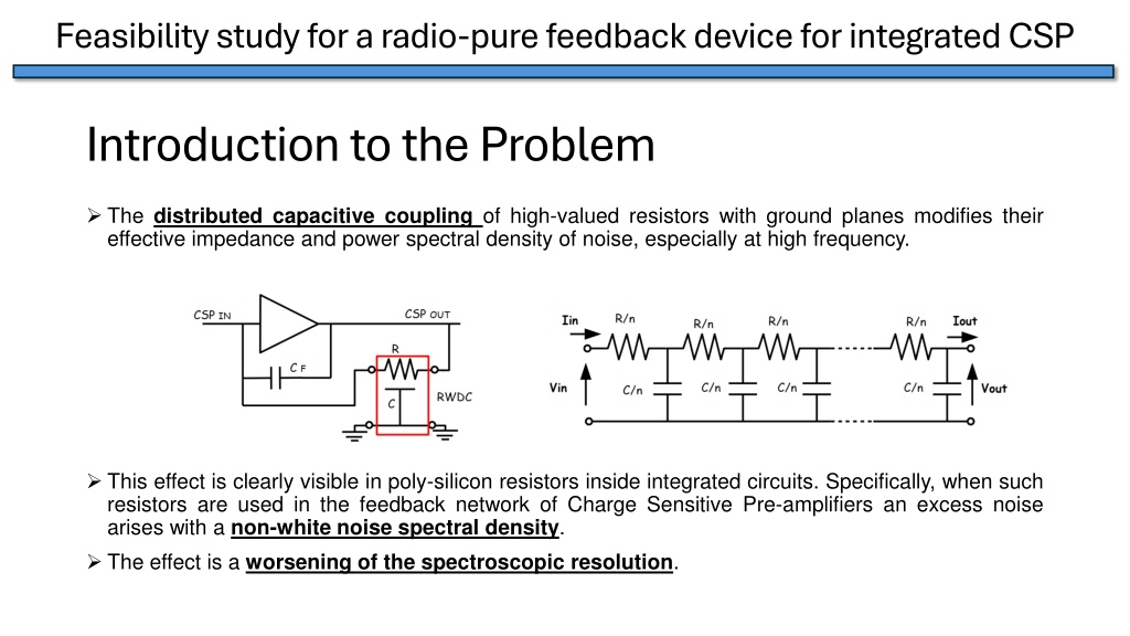 Feasibilitystudy for a radio-pure feedback device for integratedCSP Introduction to the Problem The distributed capacitive coupling of high-valued resistors with ground planes modifies their effective impedance and power spectral density of noise, especially at high frequency. This effect is clearly visible in poly-silicon resistors inside integrated circuits. Specifically, when such resistors are used in the feedback network of Charge Sensitive Pre-amplifiers an excess noise arises with a non-white noise spectral density. The effect is a worsening of the spectroscopic resolution.