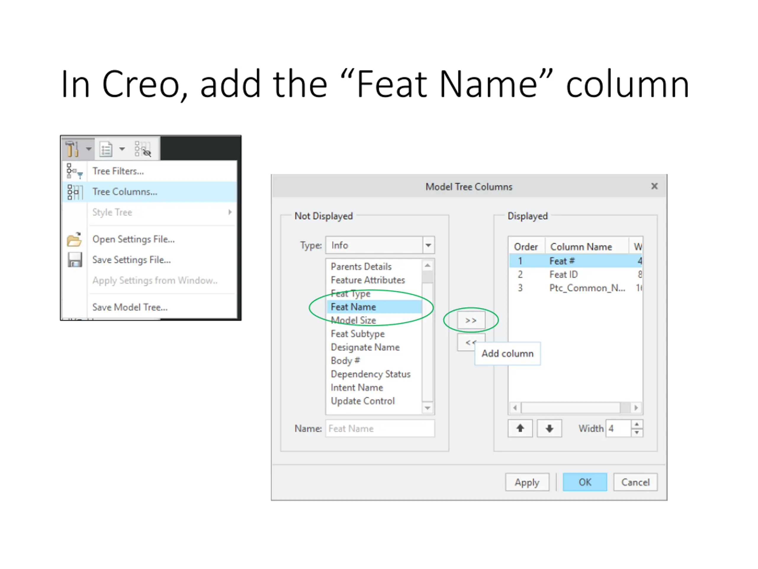 In Creo, enter Feat Name values Initially, there are no values Click in the tree and enter values