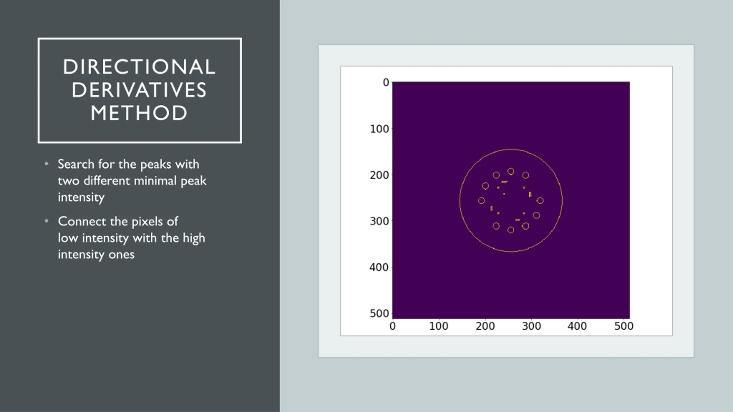DIRECTIONAL DERIVATIVES METHOD Search for the peaks with two different minimal peak intensity Connect the pixels of low intensity with the high intensity ones