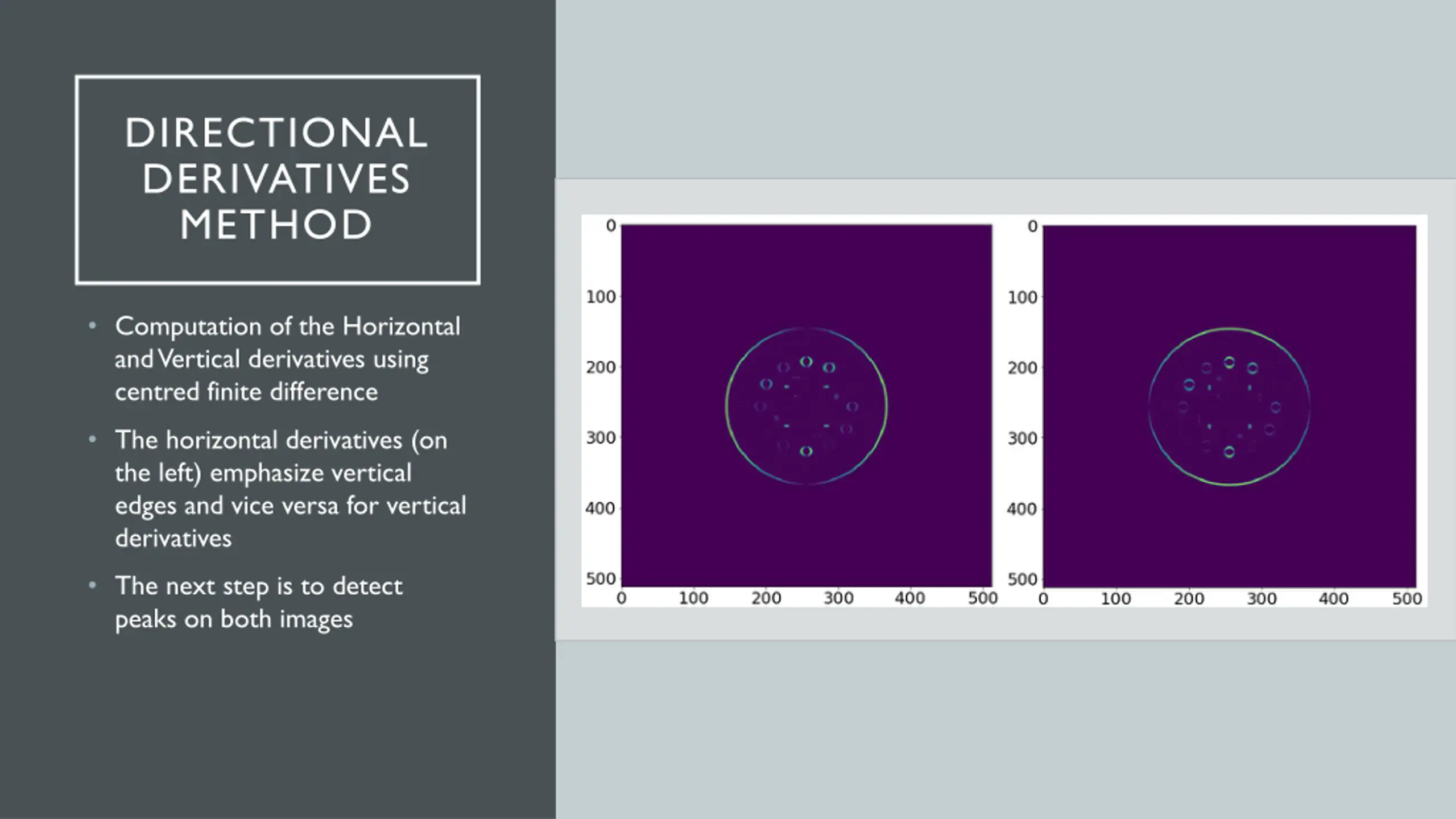 DIRECTIONAL DERIVATIVES METHOD Computation of the Horizontal and Vertical derivatives using centred finite difference The horizontal derivatives (on the left) emphasize vertical edges and vice versa for vertical derivatives The next step is to detect peaks on both images